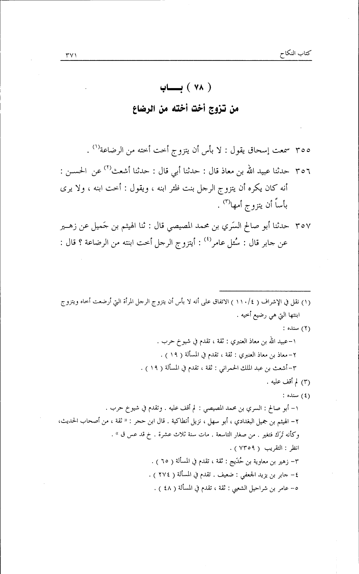 حدثنا أبو صالح السرى بن محمد المصيصى، قال: ثنا الهيثم بن جميل، عن زهير، عن جابر، قال: سئل عامر: أيتزوج الرجل أخت ابنته من الرضاعة؟