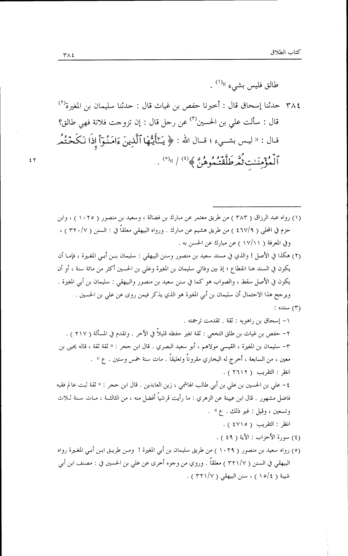 حدثنا إسحاق: قال أخبرنا حفص بن غياث، قال حدثنا سليمان بن المغيرة: قال: سألتُ علي بن الحسين عن رجل قال إن تزوجت فلانة، فهي طالق؟