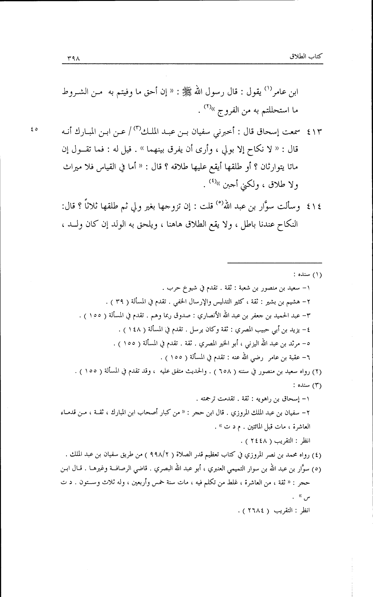 سمعت إسحاق قال: أخبرني سفيان، عن عبد الملك، /45/ عن ابن المبارك أنه قال: لا نكاح إلا بولي، وأرى أن يفرق بينهما.
