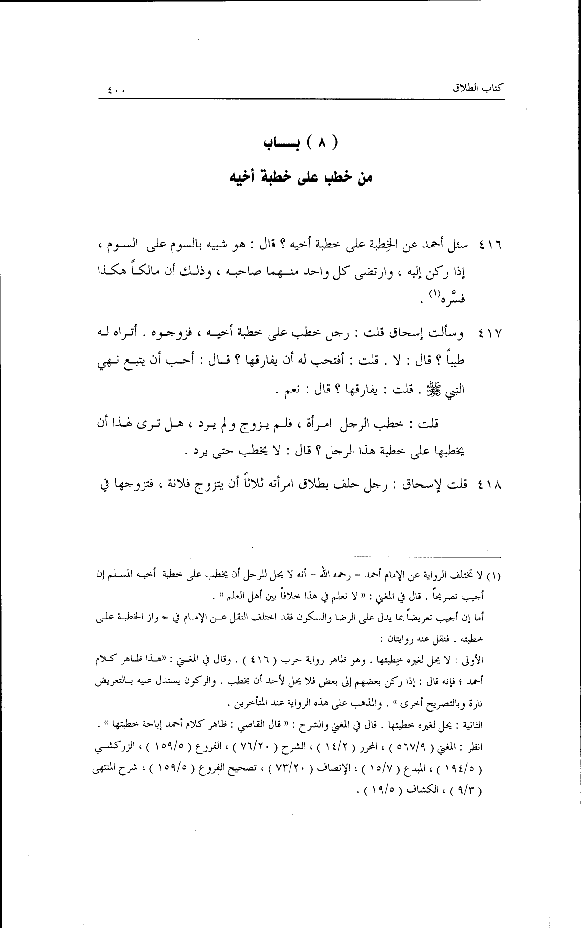 سئل أحمد عن الخطبة على خطبة أخيه.