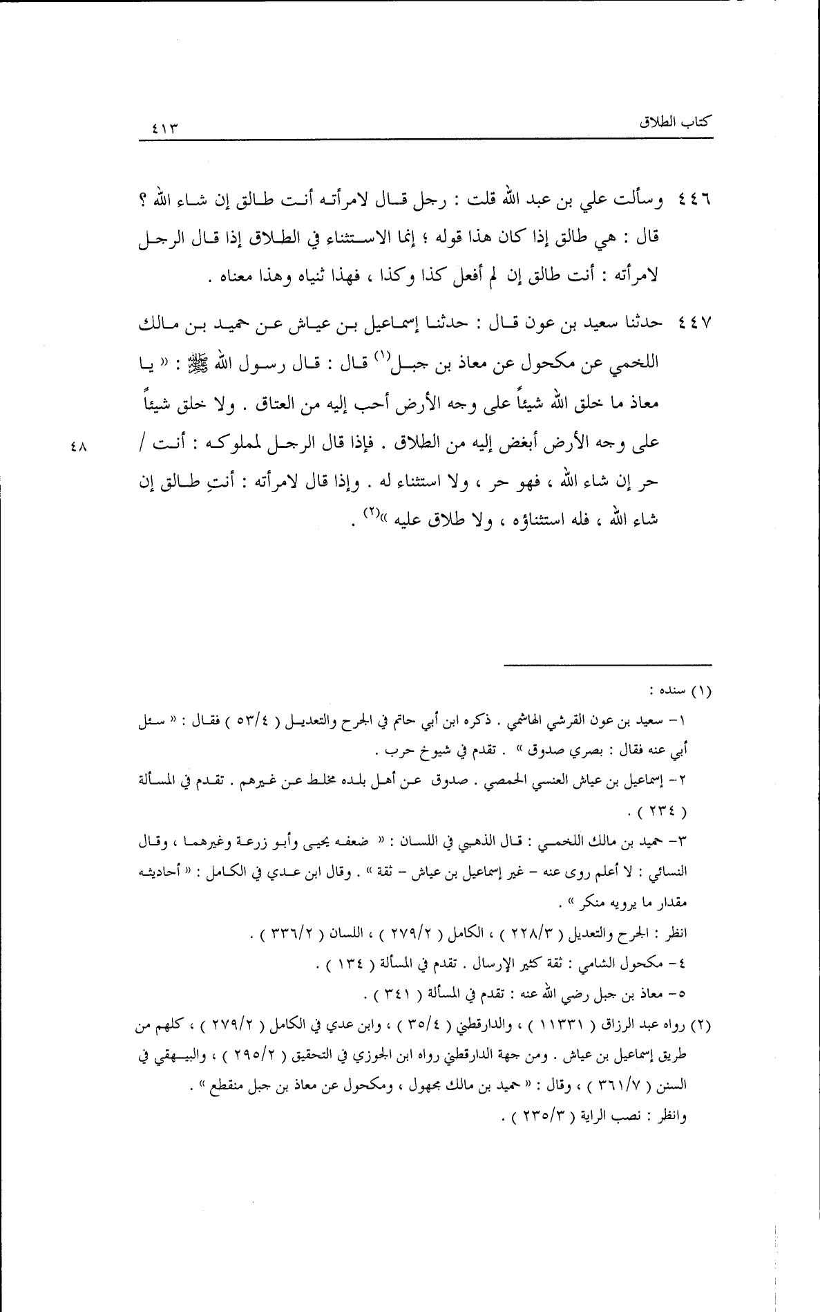 حدثنا سعيد بن عون، قال: حدثنا إسماعيل بن عياش، عن حميد بن مالك اللخمى، عن مكحول، عن معاذ بن جبل، قال: قال رسول الله - صلى الله عليه وسلم -: يا معاذ: ماخلق الله شيئًا على وجه الأرض أحب إليه من العتاق وما خلق الله شيئًا على وجه الأرض أبغض إليه من الطلاق، فإذا قال الرجل لمملوكه أنت /48/ حر إن شاء الله، فهو حر ولا استثناء له، وإذا قال لامرأته أنت طالق إن شاء الله فله استثناؤه، ولا طلاق عليه.