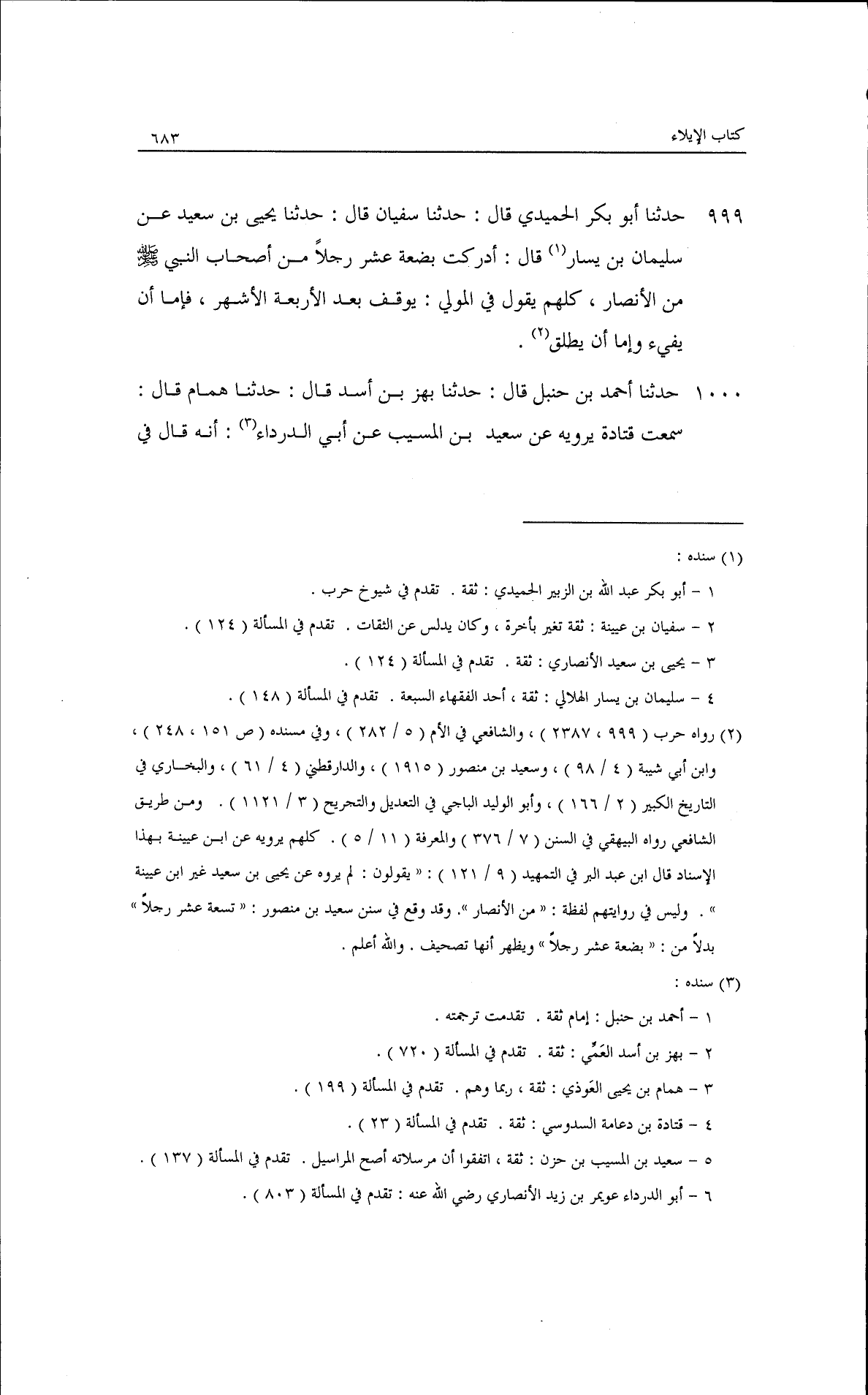 حدثنا أبو بكر الحميدي، قال: حدثنا سفيان، قال: حدثنا يحيى بن سعيد، عن سليمان بن يسار قال: أدركت بضعة عشر رجلًا من أصحاب النبي - صلى الله عليه وسلم - من الأنصار كلهم يقول في المولي يوقف بعد الأربعة الأشهر فإما أن يفئ، وإما أن يطلق. حدثنا أحمد بن حنبل، قال: ثنا بهز بن أسيد، قال: حدثنا همام، قال: سمعت قتادة يرويه، عن سعيد بن المسيب، عن أبي الدرداء قال في
