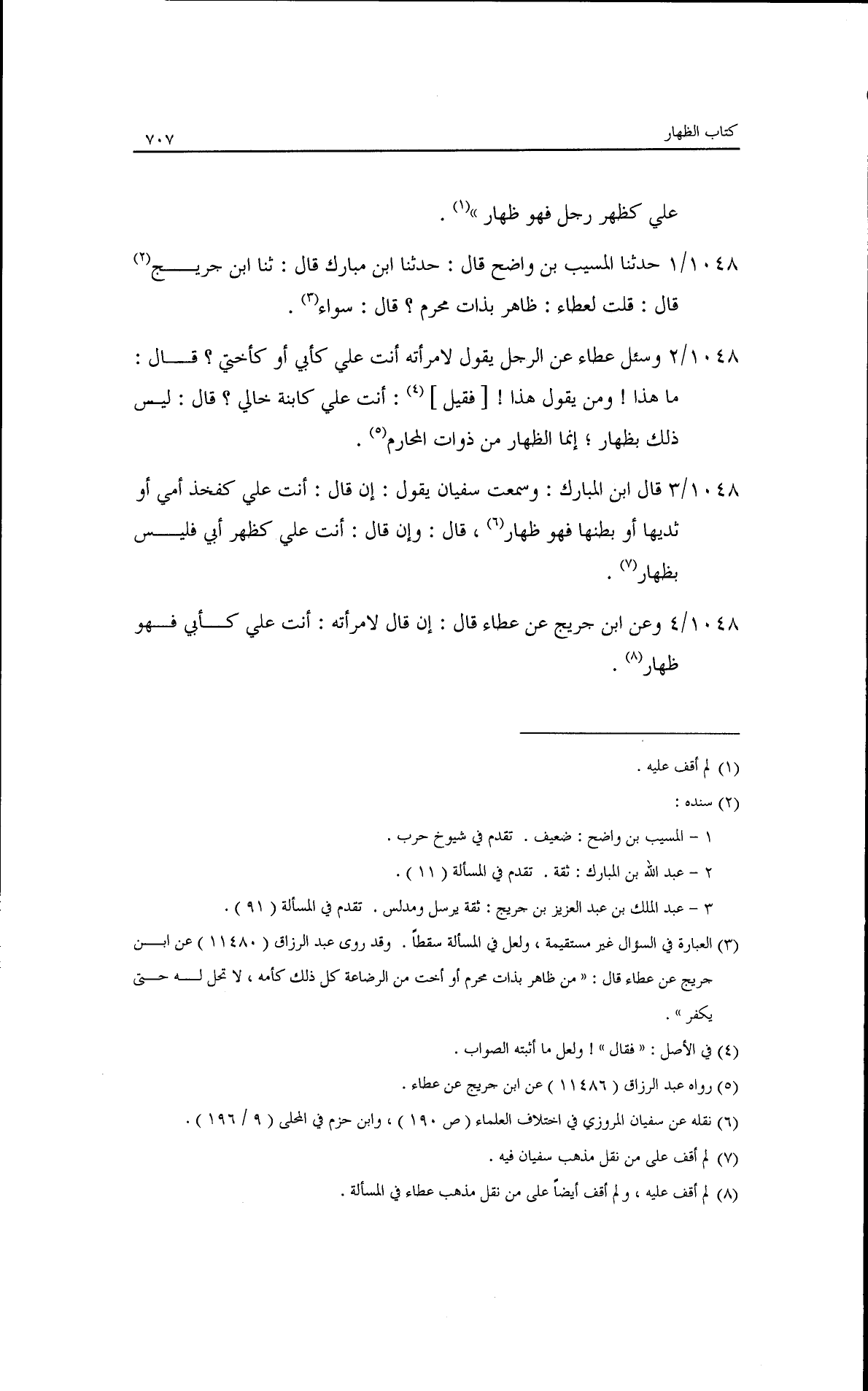 قال ابن المبارك: وسمعت سفيان يقول: إن قال: أنت علي كفخذ أمي، أو ثدييها، أو بطنها· فهو ظهار· قال: وإن قال أنت عليّ كظهر أبي· فليس بظهار.