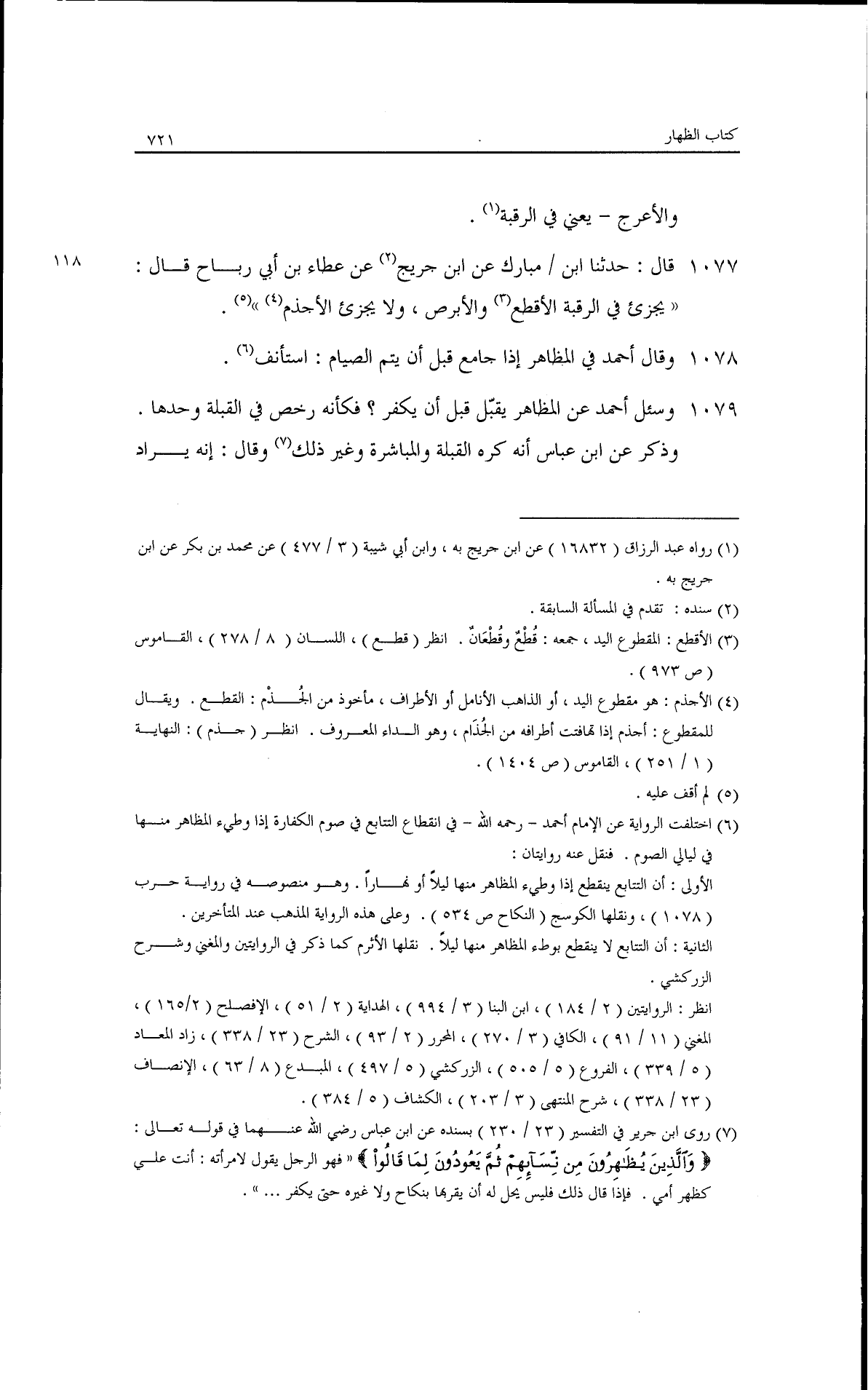 والأعرج يعني في الرقبة. وقال: حدثنا ابن/115/مبارك، عن ابن جريج، عن عطاء بن أبي رباح قال: يجزئ في الرقبة الأقطع والأبرص ولا يجزئ الأجذم.