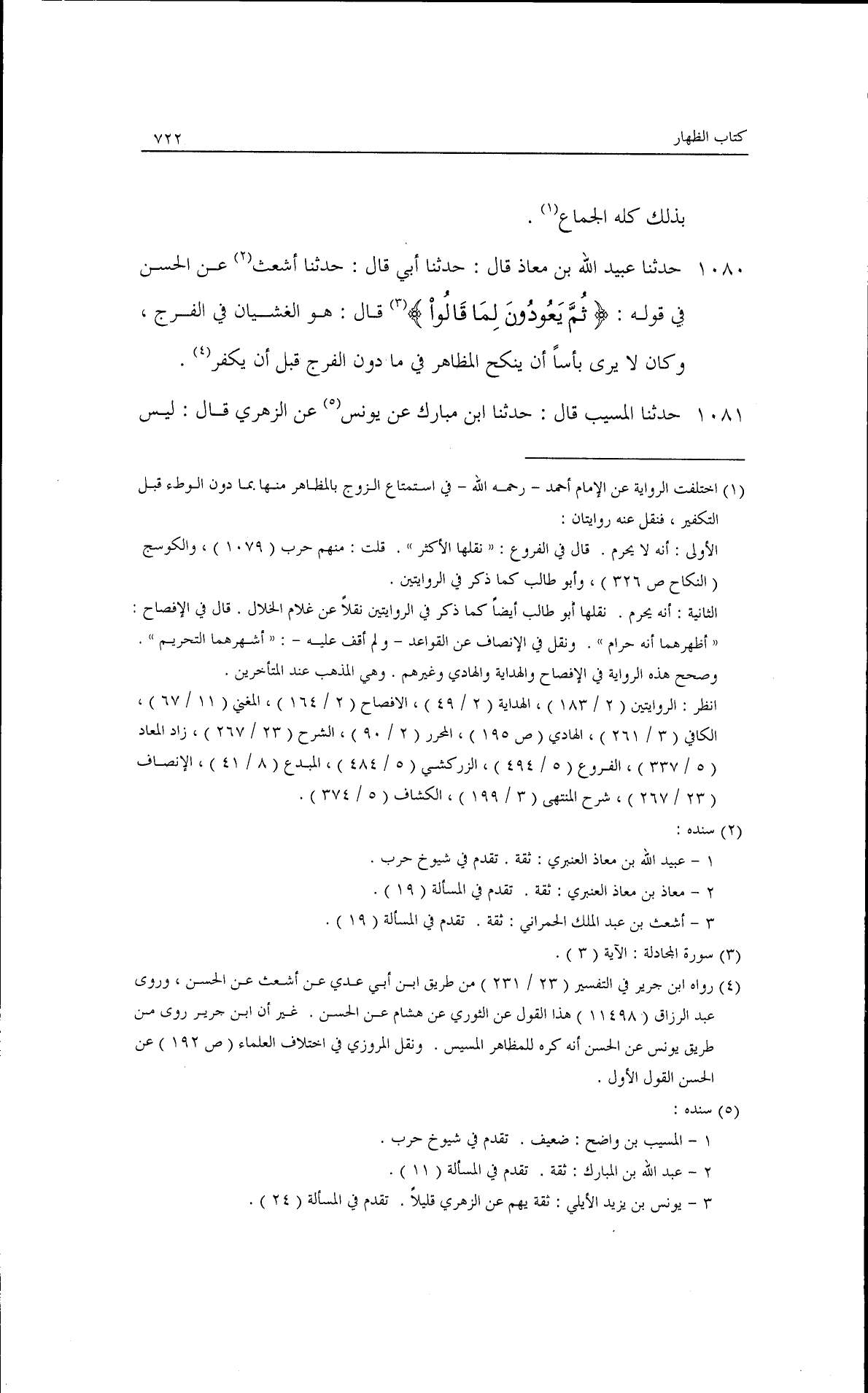 حدثنا عبيد الله بن معاذ قال: حدثنا أبي قال: حدثنا أشعث، عن الحسن في قوله: {ثُمَّ يَعُودُونَ لِمَا قَالُوا} [المجادلة: 3] قال: هو الغشيان في الفرج، وكان لا يرى بأسًا أن ينكح المظاهر في مادون الفرج قبل أن يُكَّفر.