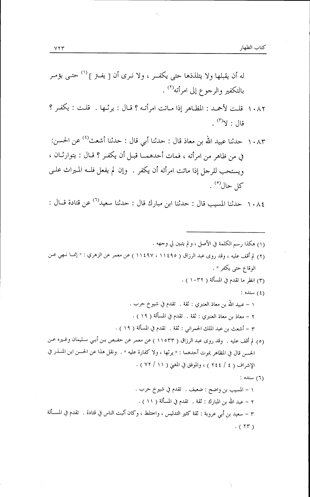 له أن يقبلها ولا يتلذذها حتى يُكَّفر ولا نرى أن (.....) (¬1) حتى يؤمر بالتكفير والرجوع إلى امرأته· قلت لأحمد: المظاهر إذا ماتت امرأته؟ قال: يرثها· قلت: يكفر؟ قال: لا· حدثنا عبيد الله ابن معاذ، قال: حدثنا أبي، قال: حدثنا أشعث، عن الحسن فيمن ظاهر من امرأته، فمات أحدهما قبل أن يُكفر· قال: يتوارثان، ويستحب للرجل إذا ماتت امرأته أن يكفر وإن لم يفعل فله الميراث على كل حال.