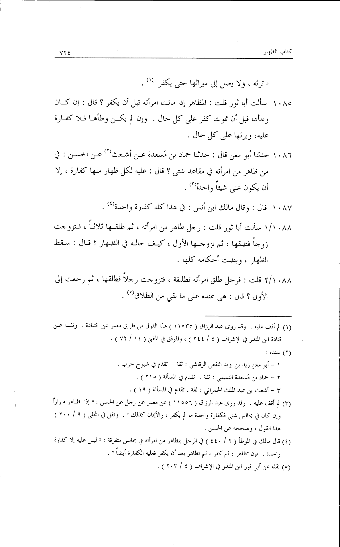 سألت أبا ثور قلت: رجل ظاهر من امرأته ثم طلقها ثلاثًا، فتزوجت زوجًا، فطلقها، ثم تزوجها الأول كيف حاله في الظهار؟ قال: سقط الظهار وبطلت أحرامه كلها· قلت فرجل طلق امرأته تطليقة، فتزوجت رجلًا، فطلقها ثم رجعت إلى الأول؟ قال: هي عنده على ما بقي من الطلاق.
