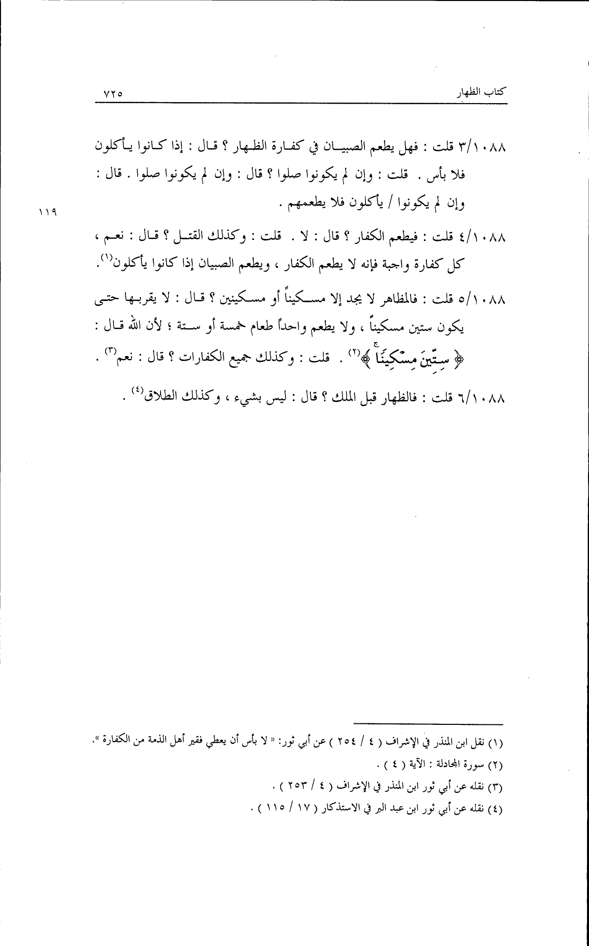 قلت: فهل يطعم الصبيان في كفارة الظهار؟ قال: إذا كانوا يأكلون/116/فلا بأس· قلت وإن لم يكونوا صَلُّوا؟ قال: وإن لم يكونوا صَلُّوا· قال: وإن لم يكونوا يأكلون فلا يطعمهم· قلت فيطعم الكفار؟ قال: لا· قلت: وكذلك القتل؟ قال: نعم كل كفارة واجبة فأنه لا يطعم الكفار ويطعم الصبيان إذا كانوا يأكلون· قلت فالمظاهر لا يجد إلا مسكينًا أو مسكينين؟ قال: لا يقربها حتى يكون ستين مسكينًا، ولا يطعم واحدًا طعام خمسة أو ستة لأن الله قال: {سِتِّينَ مِسْكِينًا} قلت: وكذلك جمع الكفارات؟ قال: نعم· قلت: فالظهار قبل الملك؟ قال: ليس بشيء، وكذلك الطلاق.