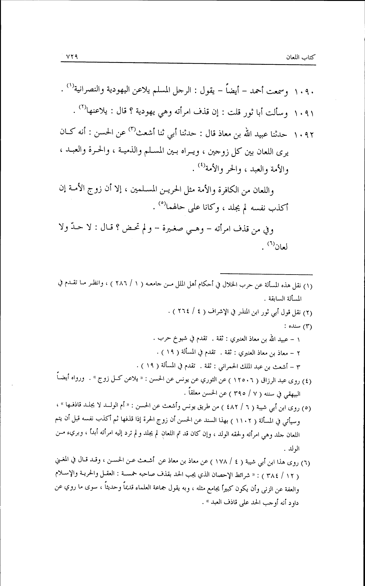 حدثنا عبيد الله بن معاذ قال: حدثنا أبي، نا أشعث، عن الحسن أنه كان يرى اللعان بين كل زوجين، ويراه بين المسلم والذمية، والحرة والعبد، والأمة والعبد، والحر والأمة، واللعان من الكافرة والأمة مثل الحرين المسلمين، إلا إن روح الأمة إن أكذب نفسه لم يجلد وكانا على حالهما وفيمن قذف امرأته وهي صغيرة ولم تحض قال: لا حد، ولا لعان.