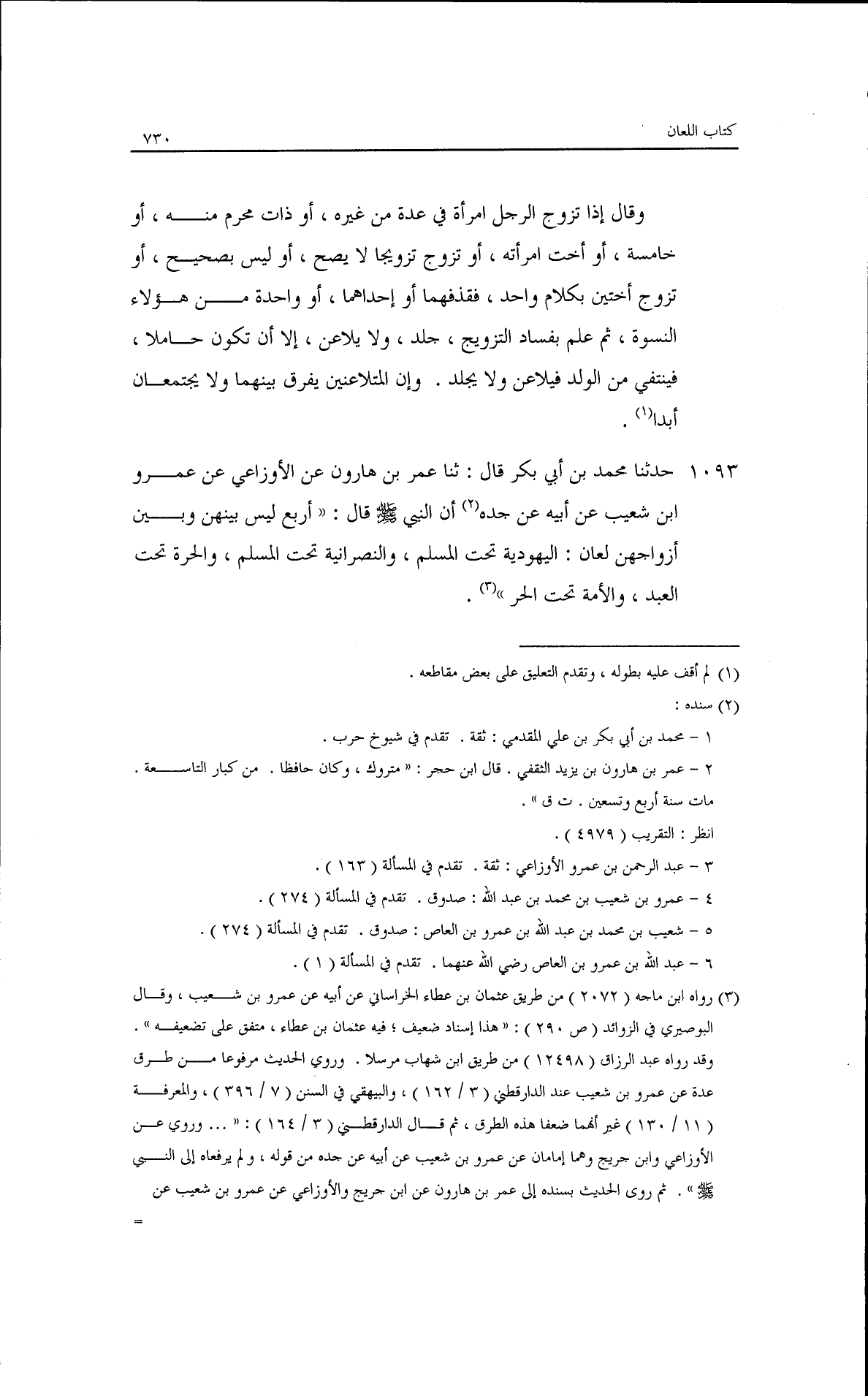حدثنا محمد بن أبي بكر قال: ثنا عمر بن هارون، عن الأوزاعي، عن عمرو بن شعيب، عن أبيه، عن جده أن النبي - صلى الله عليه وسلم - قال: ((أربع ليس بينهن وبين أزواجهن لعان اليهودية تحت المسلم، والنصرانية تحت المسلم، والحرة تحت العبد، والأمة تحت الحر)).