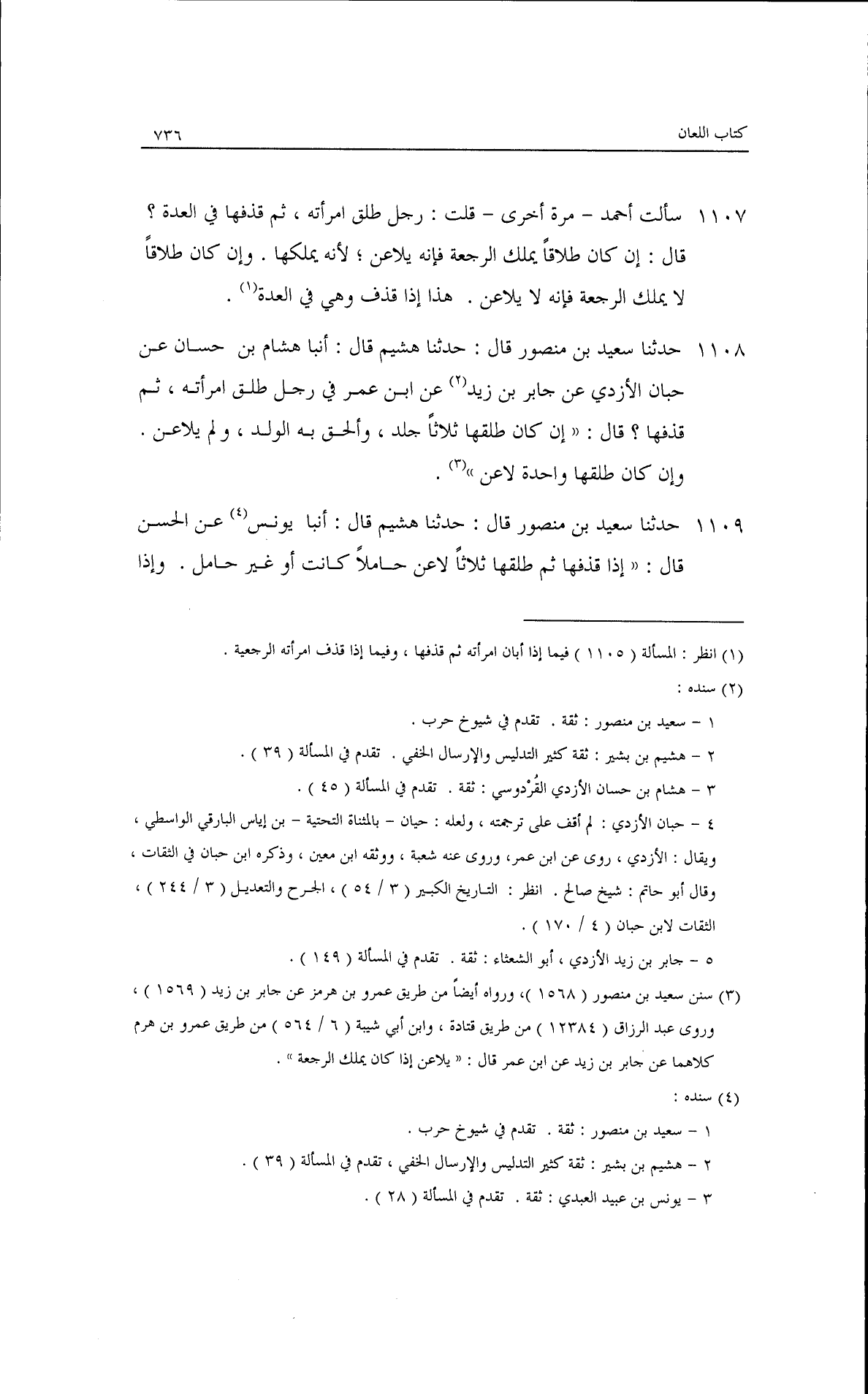 حدثنا سعيد بن منصور، قال: حدثنا هشيم، قال: أنبأ يونس، عن الحسن قال: إذا قذفها ثم طلقها ثلاثًا لاعن حاملًا كانت أو غير حامل، وإذا
