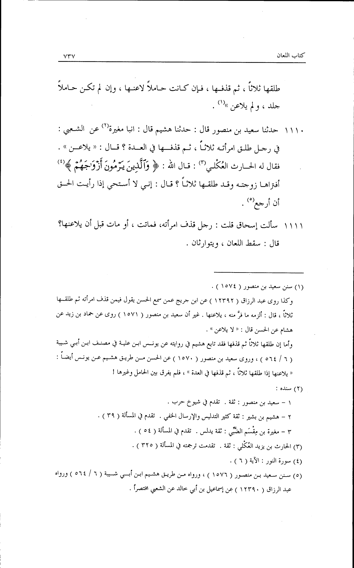 حدثنا سعيد بن منصور، قال: حدثنا هشيم، قال: أنبأ مغيرة، عن الشعبي في رجل طلق امرأته ثلاثًا ثم قذفها في العدةقال: يلاعن· فقال له الحارث العكلي: قال الله: {وَالَّذِينَ يَرْمُونَ أَزْوَاجَهُمْ} [النور: 6] أفتراها زوجته وقد طلقها ثلاثًا!، ثم قال: إني لأستحي إذا رأيت الحق أن أرجع.