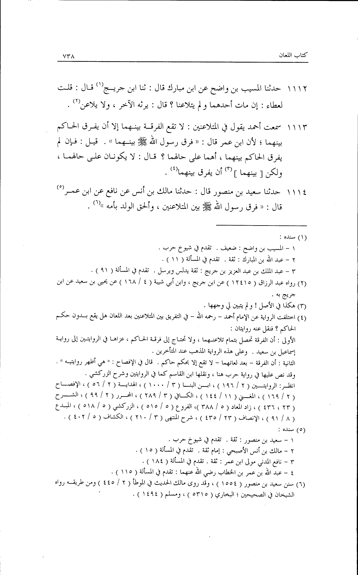 حدثنا سعيد بن منصور، قال: حدثنا مالك بن أنس، عن نافع، عن ابن عمر قال: فرق رسول الله - صلى الله عليه وسلم - بين المتلاعنين وألحق الولد بأمه.