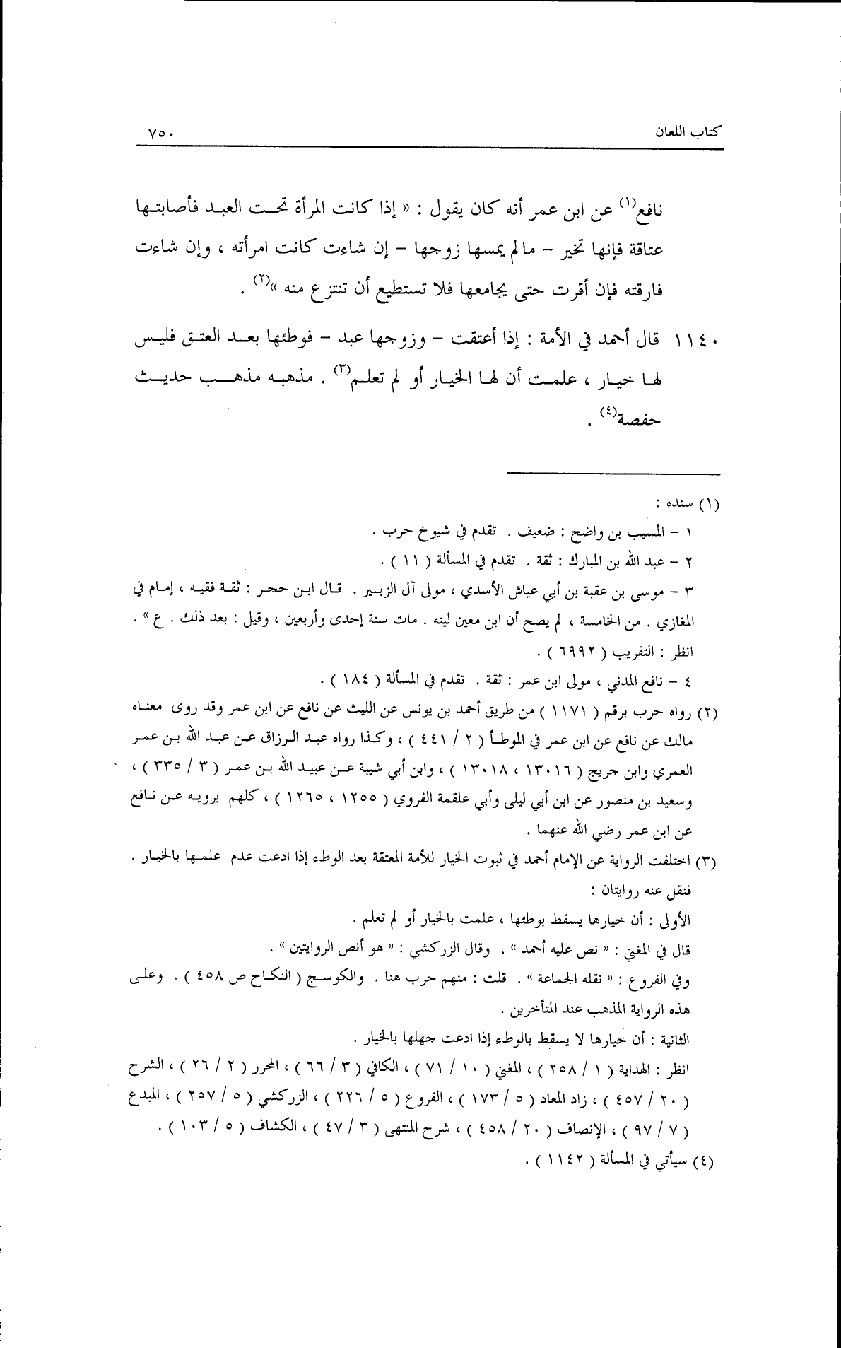 نافع، عن ابن عمر أنه كان يقول: إذا كانت المرأة تحت العبد فأصابتها عتاقة فأنها تخير ما لم يمسها زوجها إن شاءت كانت امرأته وإن شاءت فارقته فإن أقرت حتى يجامعها فلا تستطيع أن تنتزع منه.
