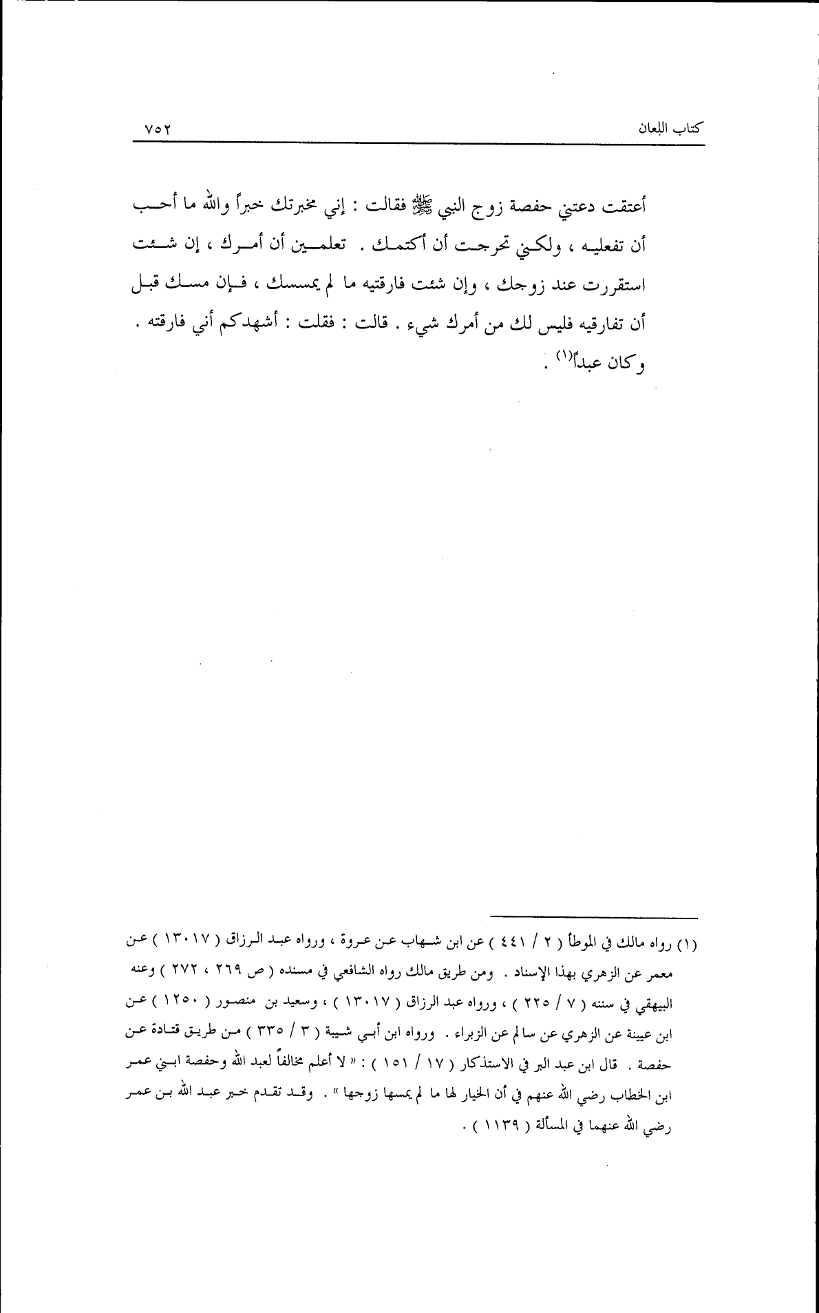 أعتقت دعتني حفصة زوج النبي - صلى الله عليه وسلم - فقالت: إني مخبرتك خبرًا والله ما أحب أن تفعليه ولكني تحرجت أن أكتمك، تعلمين أمرك بيدك إن شئت استقررت عند زوجك، (وإن شئت فارقتيه) (¬1) ما لم يمسسك فإن مسّك قبل أن تفارقيه فليس لك من أمرك شيء· قالت: فقلت: أشهدكم أني فارقته. وكان عبدًا.