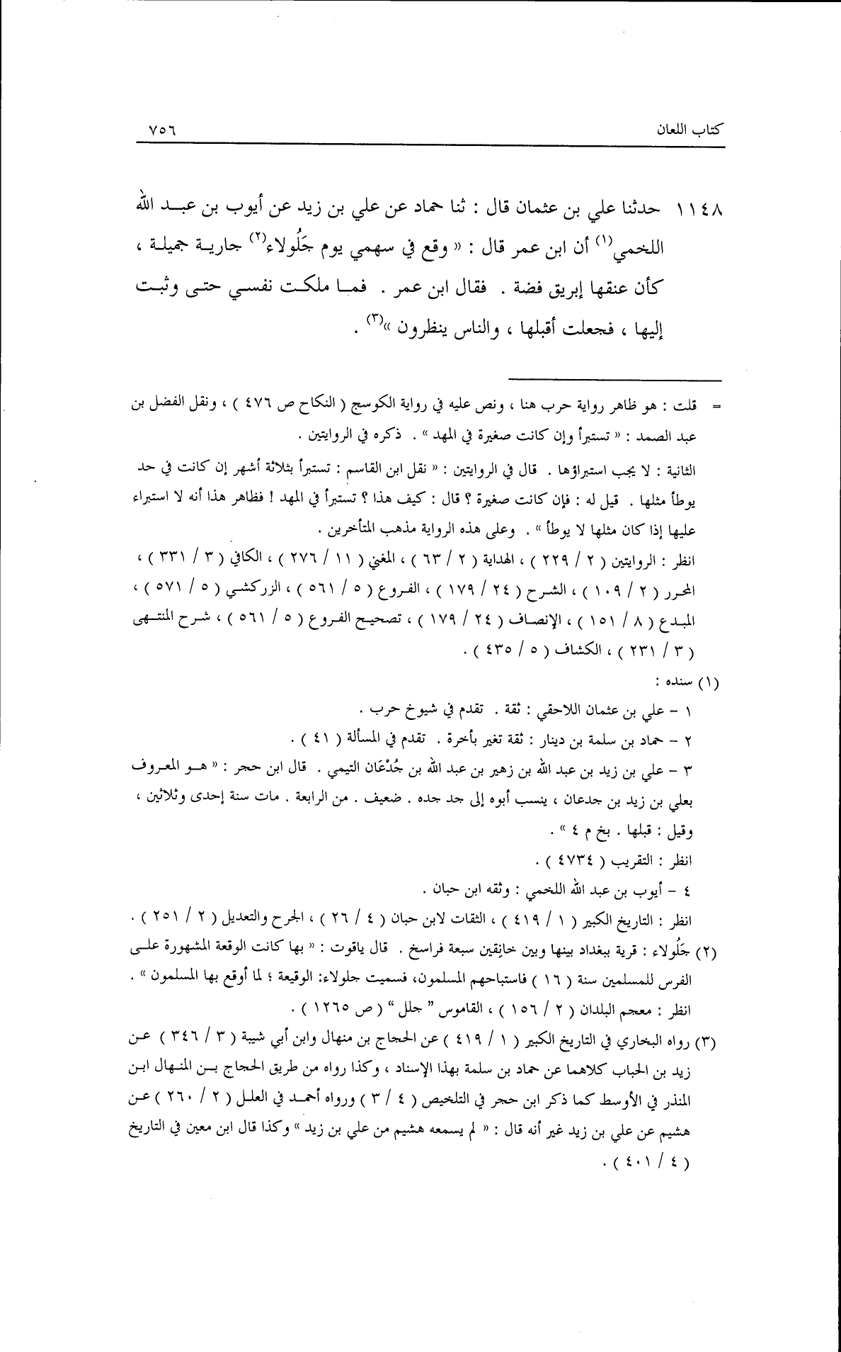 حدثنا علي بن عثمان قال: ثنا حماد، عن علي بن زيد، عن أيوب بن عبد الله اللخمي أن ابن عمر قال: وقع في سهمي يوم جلولاء جارية جميلة كأن عنقها إبريق فضة فقال ابن عمر: فما ملكت نفسي حتى وثبت إليها فجعلت أقبلها والناس ينظرون.
