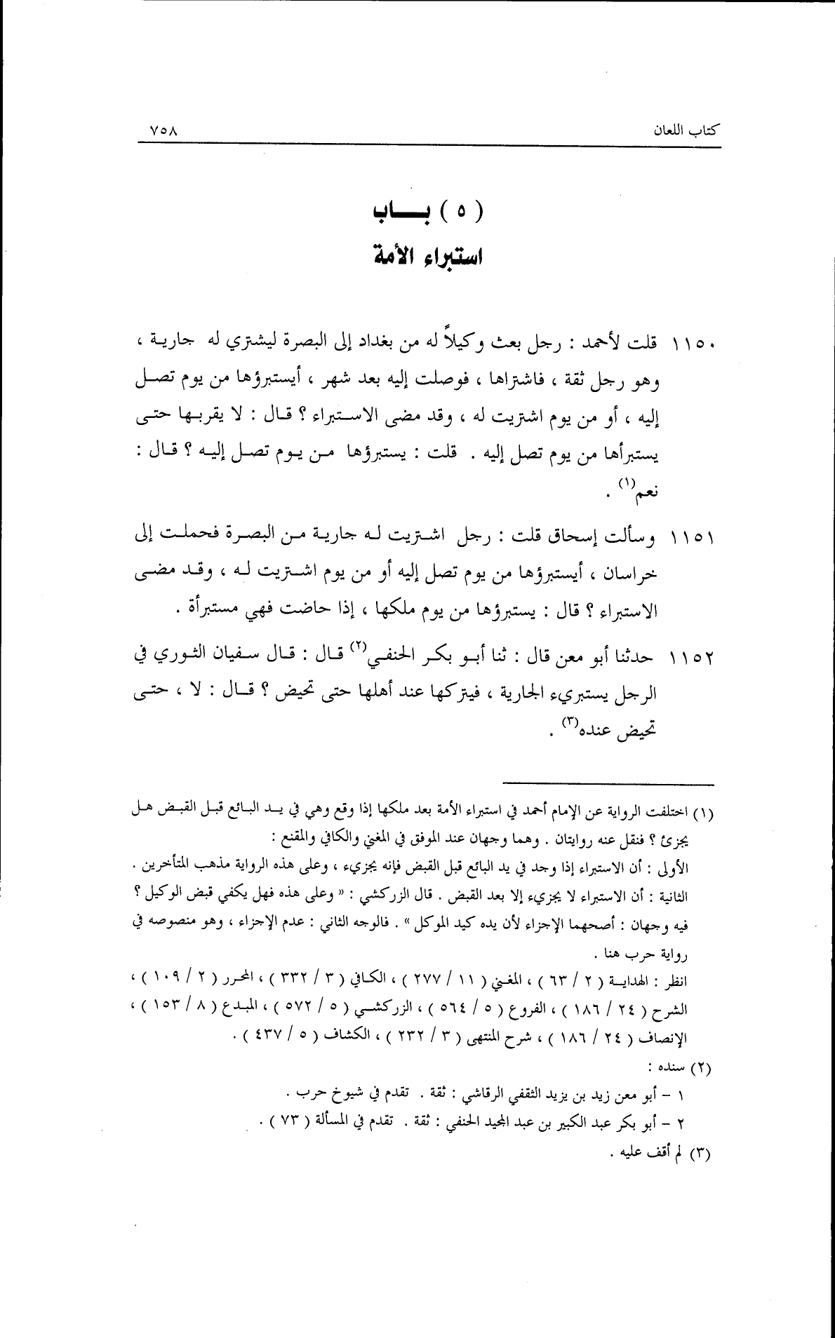 وسألتُ إسحاقَ قلت: رجل أُشتريت له جارية من البصرة فحُملت إلى خراسان أيستبرئها من يوم تصل إليه أو من يوم أُشتريت له وقد مضى الاستبراء؟ قال: يستبرئها من يوم ملكها إذا حاضت فهي مستبرأة.