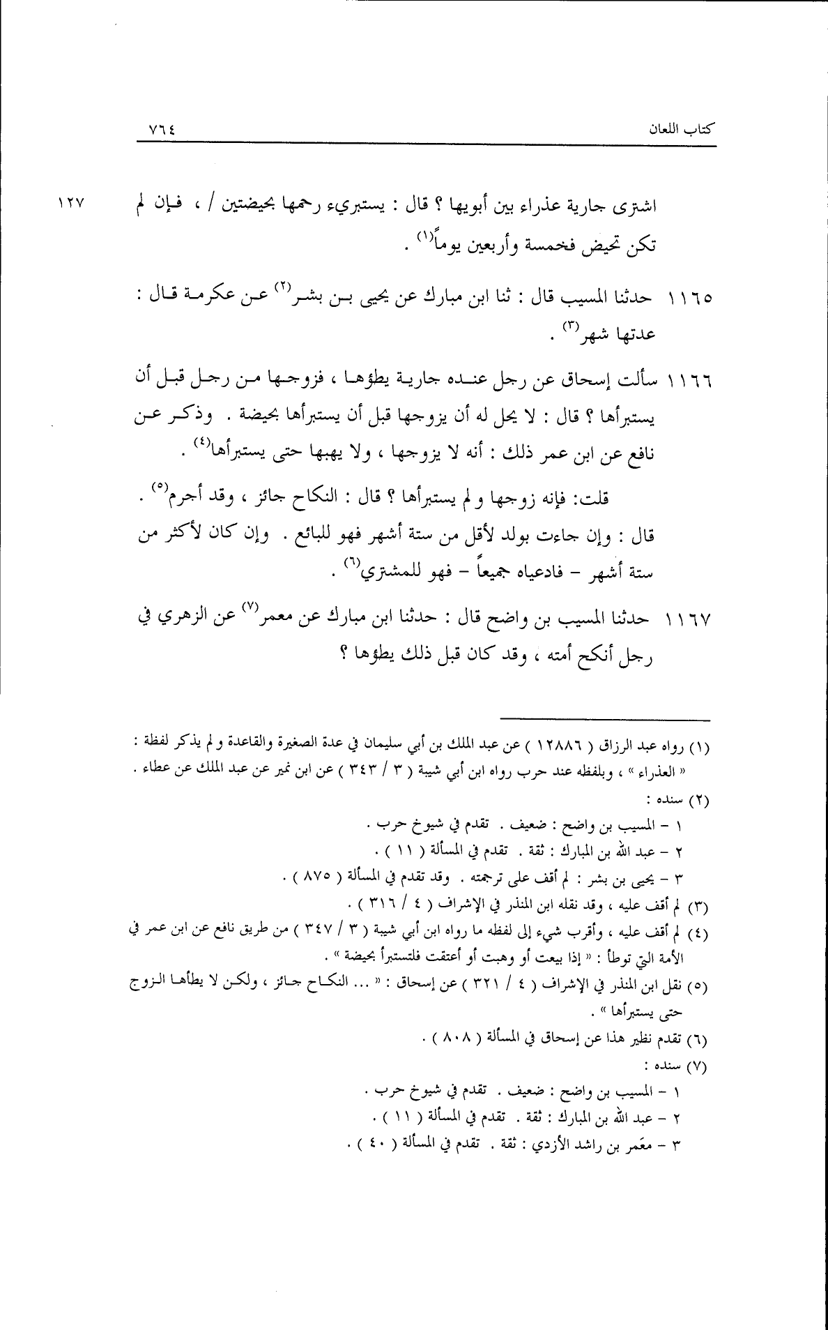 اشترى جارية عذراء بين أبويها. قال: يستبرئ رحمها بحيضتين/124/، فإن لم تكن تحيض فخمسة وأربعين يومًا·حدثنا المسيب، قال: ثنا ابن مبارك، عن يحيى بن بشر، عن عكرمة قال: عدتها شهر·سألت إسحاق، عن رجل له جارية يطؤها، فزوجها من رجل قبل أن يستبرئها· قال: لا يحل له أن يزوجها حتى يستبرئها بحيضة· وذكر نافع، عن ابن عمر ذلك أنه لا يزوجها ولا يهبها حتى يستبرئها· قلت: فإنه زوجها ولم يستبرئها؟ قال: النكاح جائز وقد أجرم قال: وإن جاءت بولد لأقل من ستة أشهر فهو للبائع وإن كان لأكثر من ستة أشهر فادعياه جميعًا فهو للمشتري·حدثنا المسيب بن واضح، قال: حدثنا ابن مبارك، عن معمر، عن الزهري في رجل أنكح أمته وقد كان قبل ذلك يطؤها