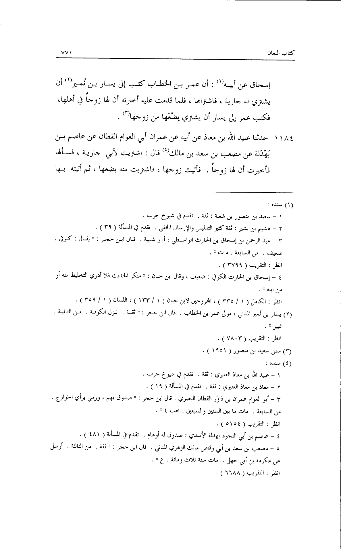 إسحاق، عن أبيه أن عمربن الخطاب كتب إلى يسار بن نمير إن يشتري له جارية، فاشتراها، فلما قدمت عليه أخبرته أن لها زوجًا في أهلها، فكتب عمر إلى يسار أن يشتري بضعها من زوجها.