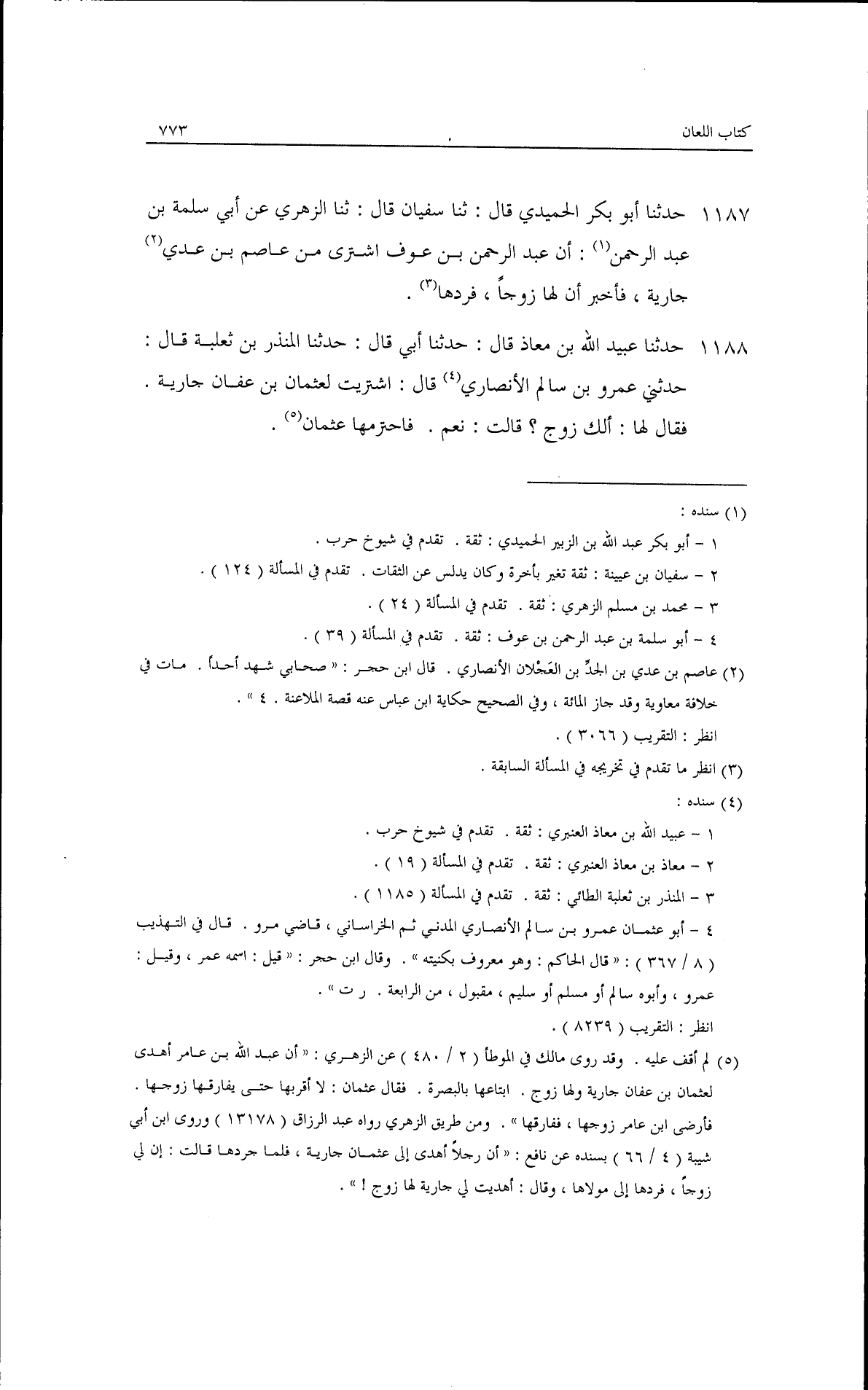 حدثنا أبو بكر الحميدي، قال: ثنا سفيان، قال: ثنا الزهري، عن أبي سلمة بن عبد الرحمن إن عبد الرحمن بن عوف اشترى من عاصم بن عدي جارية، فأخبر أن لها زوجًا فردها.