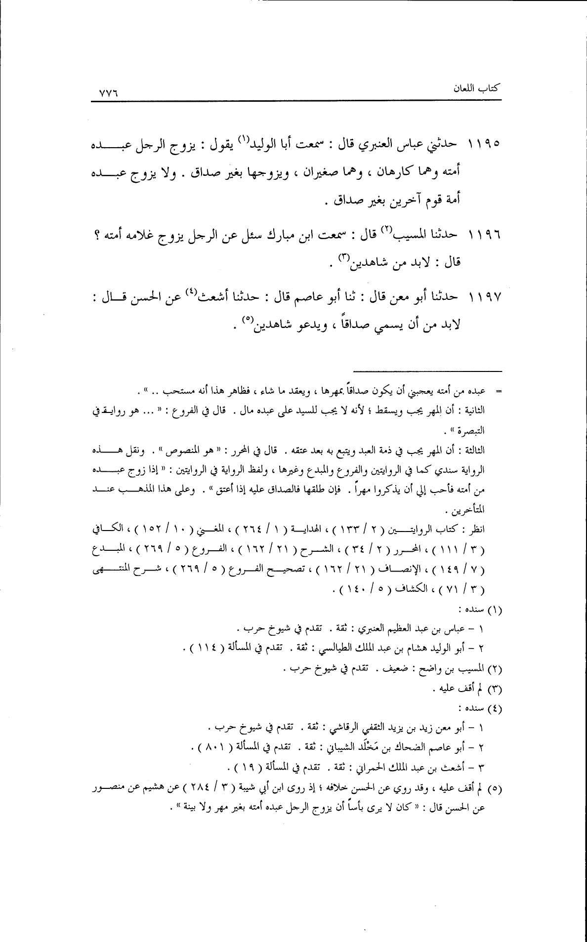 حدثنا المسيب، قال: سمعت ابن مبارك سُئلَ عن الرجل يزوج غلامه أمته· قال: لا بد من شاهدين.