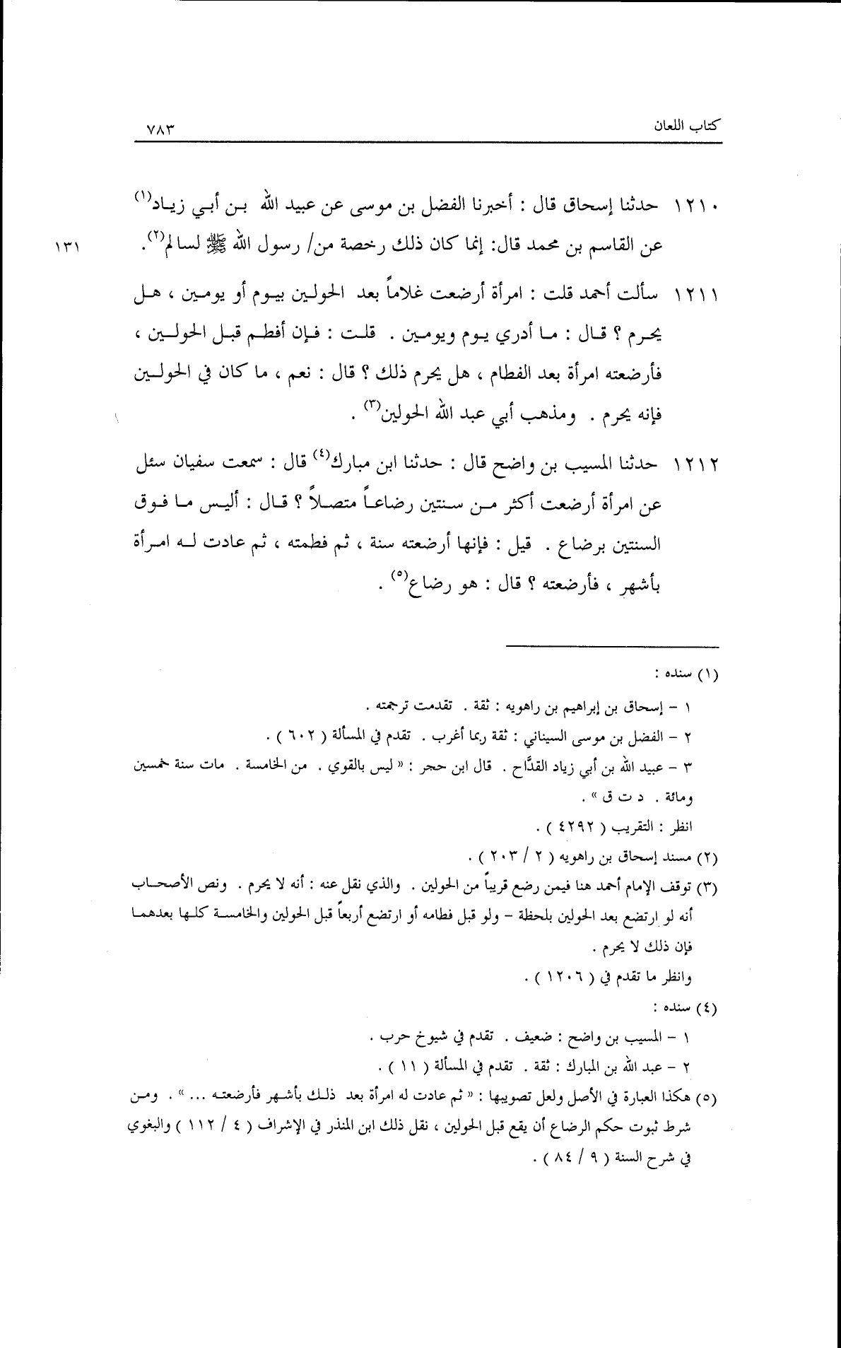 سألتُ أحمدَ قلتُ: امرأة أرضعت غلامًا بعد الحولين بيوم أو يومين هل يحرم؟ قال: ما أدري يوم أو يومين· قلت: فإن أفطم قبل الحولين فأرضعته امرأة بعد الفطام هل يحرم ذلك؟ قال: نعم ما كان في الحولين فأنه يحرم ومذهب أبي عبد الله الحولين.