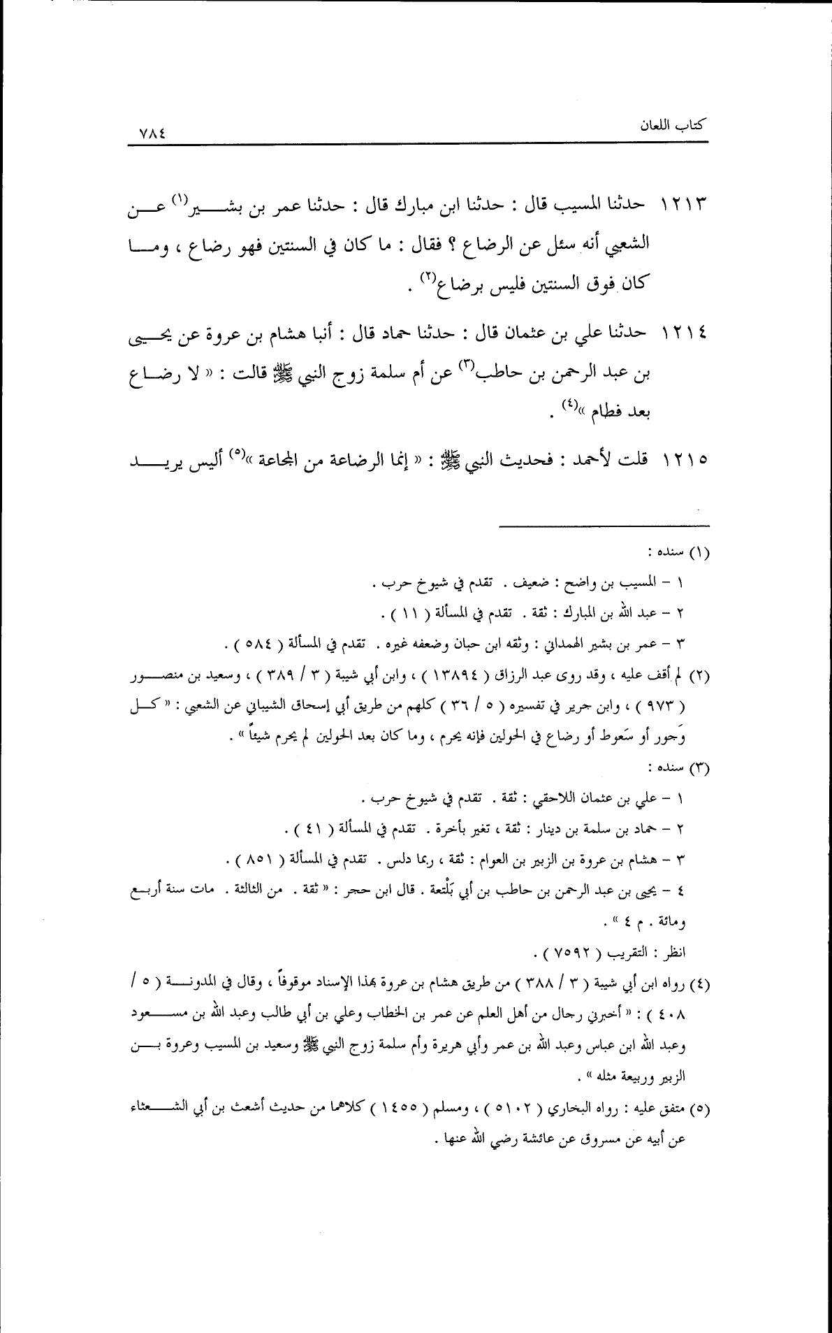 حدثنا المسيب قال: حدثنا ابن مبارك، قال: حدثنا عمر بن بشير، عن الشعبي أنه سُئلَ عن الرضاع فقال: ما كان في السنتين فهو رضاع، وما كان فوق السنتين فليس برضاع·حدثنا علي بن عثمان قال: حدثنا حماد، قال: أنبأ هشام بن عروة، عن يحيى بن عبد الرحمن بن خاطب، عن أم سلمة زوج النبي - صلى الله عليه وسلم - قالت: لا رضاع بعد فطام.