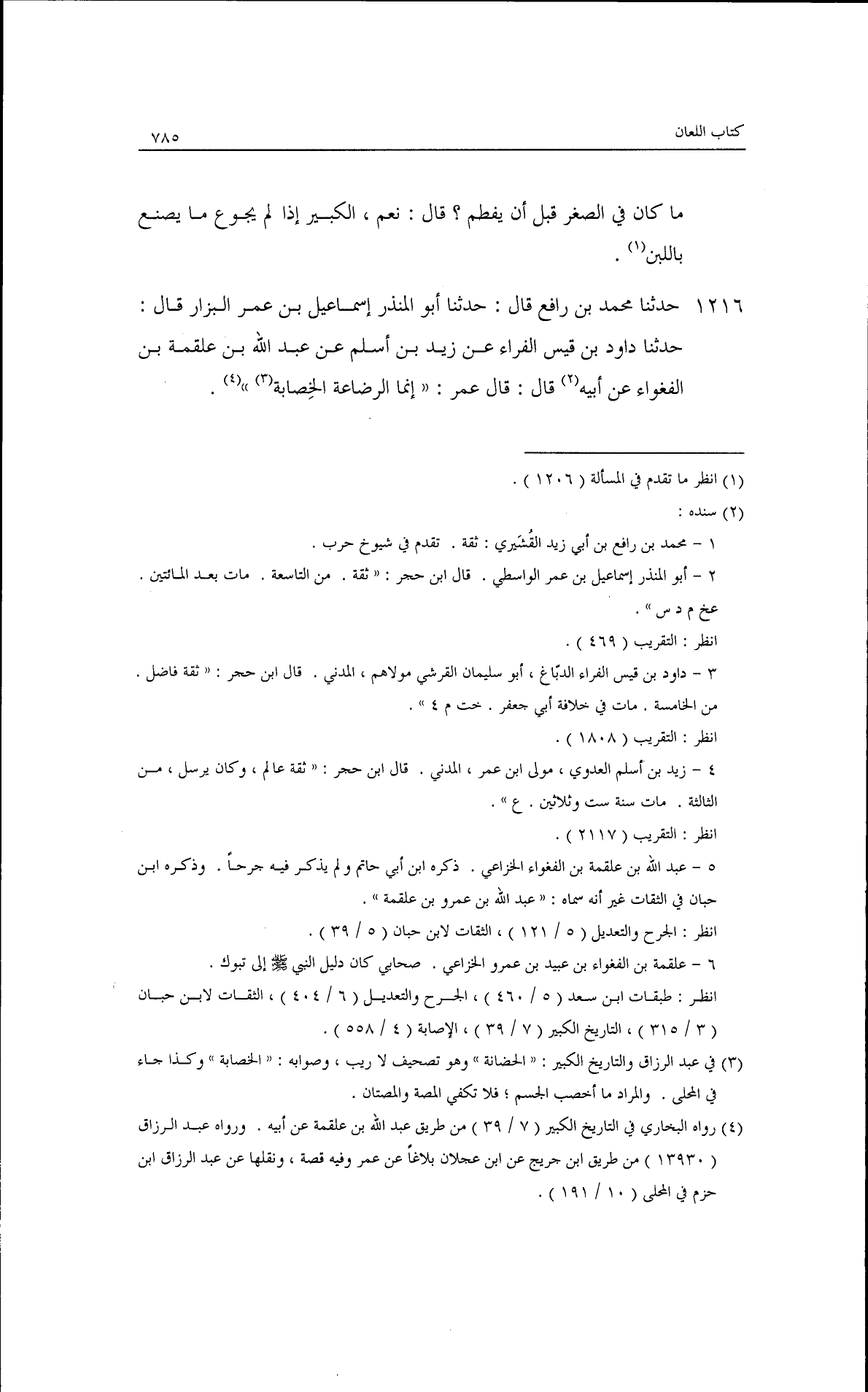 حدثنا محمد بن رافع قال: حدثنا أبو المنذر إسماعيل بن عمر البزاز قال: حدثنا داود بن قيس الفراء، عن زيد بن أسلم، عن عبد الله بن علقمة بن الفعواء، عن أبيه قال: قال عمر: إنما الرضاعة الحضانة.