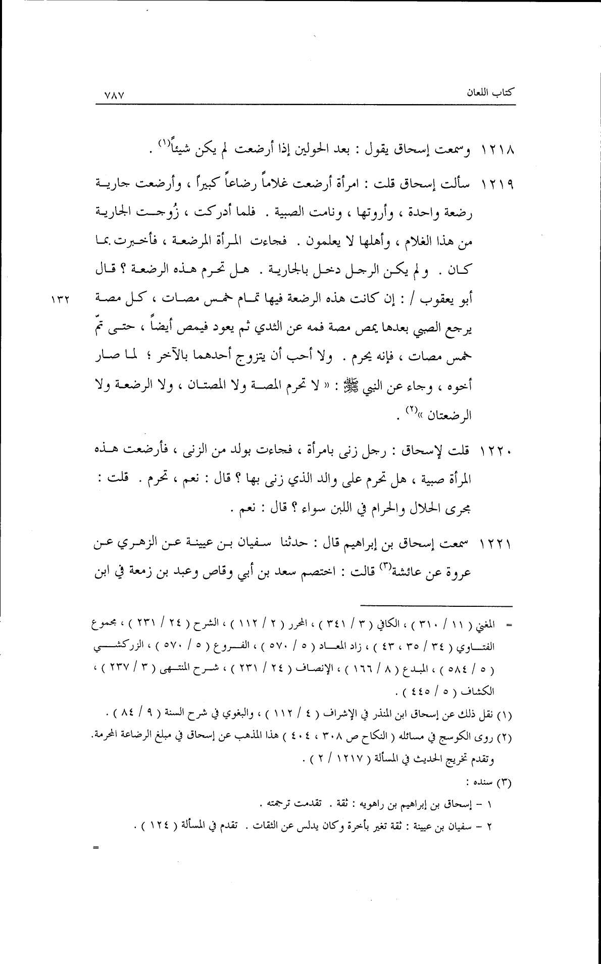 قلتُ لإسحاق: رجل زنا بامرأة فجاءت بولد من الزنا، فأرضعت هذا المرأة صبية هل تحرم على والد الذي زنا بها؟ قال: نعم تحرم· قلت: مجرى الحلال والحرام في اللبن سواء؟ قال: نعم.