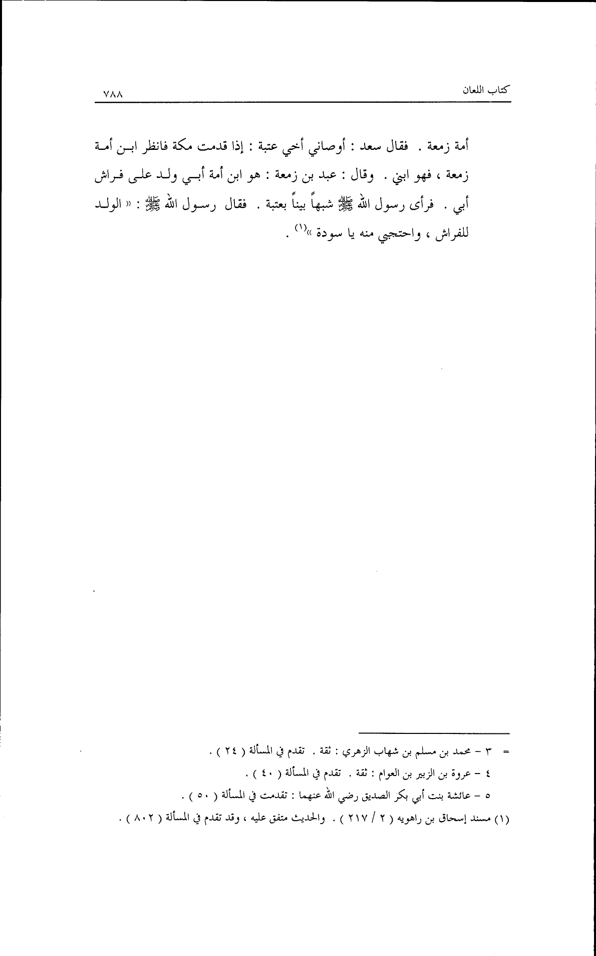أمة زمعة فقال سعد: أوصاني أخي عتبة إذا قدمت مكة فانظر ابن أمة زمعة فهو ابني· وقال عبد ابن زمعة: هو ابن امة أبي ولد على فراش أبي· فرأى رسول الله - صلى الله عليه وسلم - شبهًا بينًا بعتبة فقال رسول الله - صلى الله عليه وسلم -: ((الولد للفراش، واحتجبي منه ياسودة)).