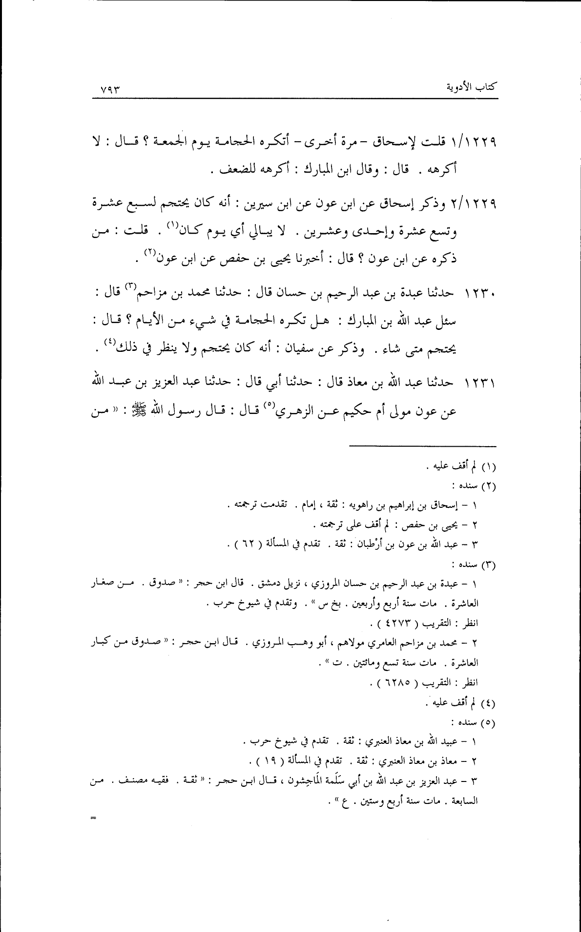 حدثنا عبدة بن عبد الرحيم بن حسان، قال: حدثنا محمد بن مزاحم قال: سُئلَ عبد الله بن المبارك: هل تكره الحجامة في شيء من الأيام؟ قال: يحتجم متى شاء· وذكر عن سفيان أنه كان يحتجم ولا ينظر في ذلك.