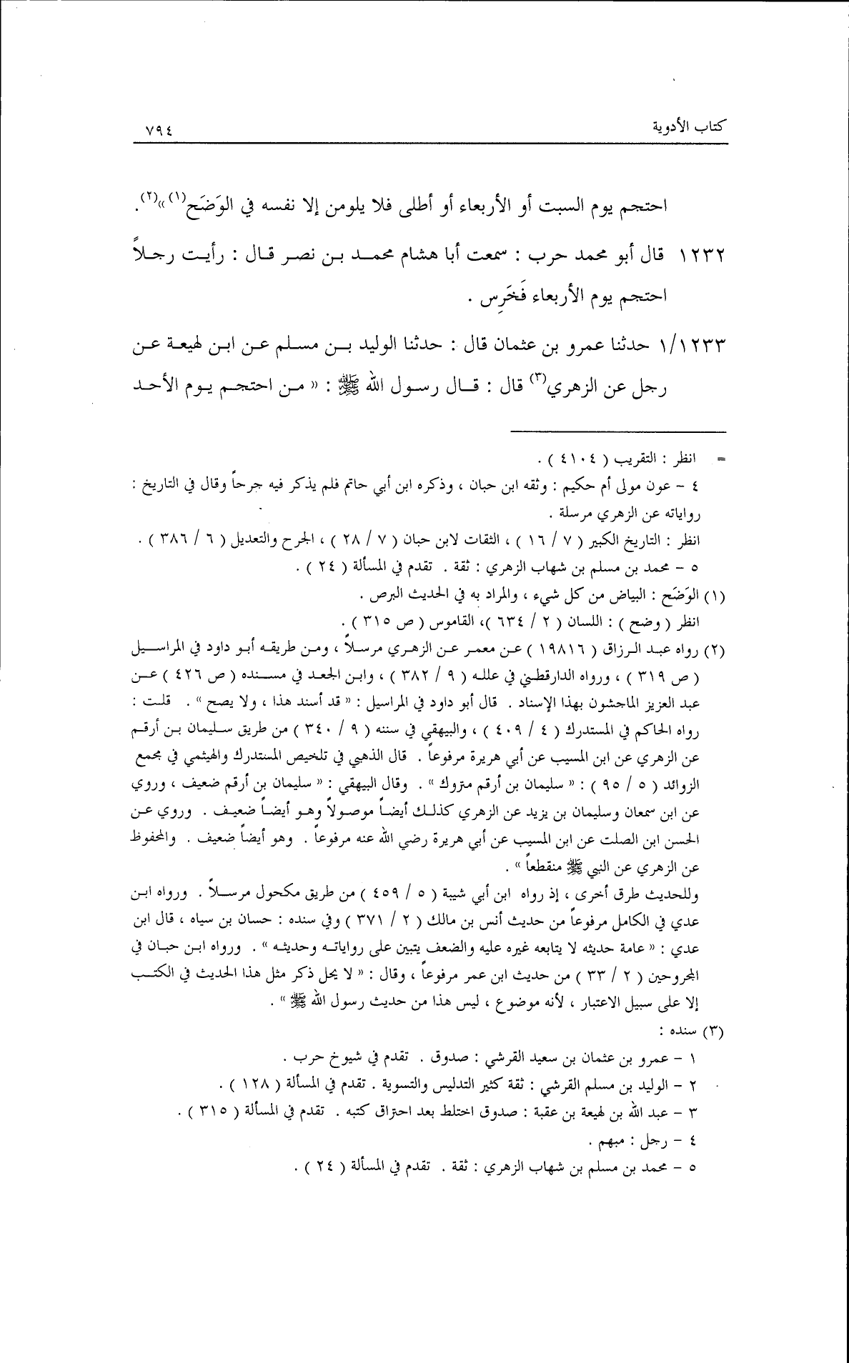 حدثنا عمرو بن عثمان قال: حدثنا الوليد بن مسلم، عن ابن لهيعة، عن رجل، عن الزهري قال: قال رسول الله - صلى الله عليه وسلم -: ((من احتجم يوم الأحد دخل فيه شفاء وخرج منه داء، ومن احتجم يوم الأحد