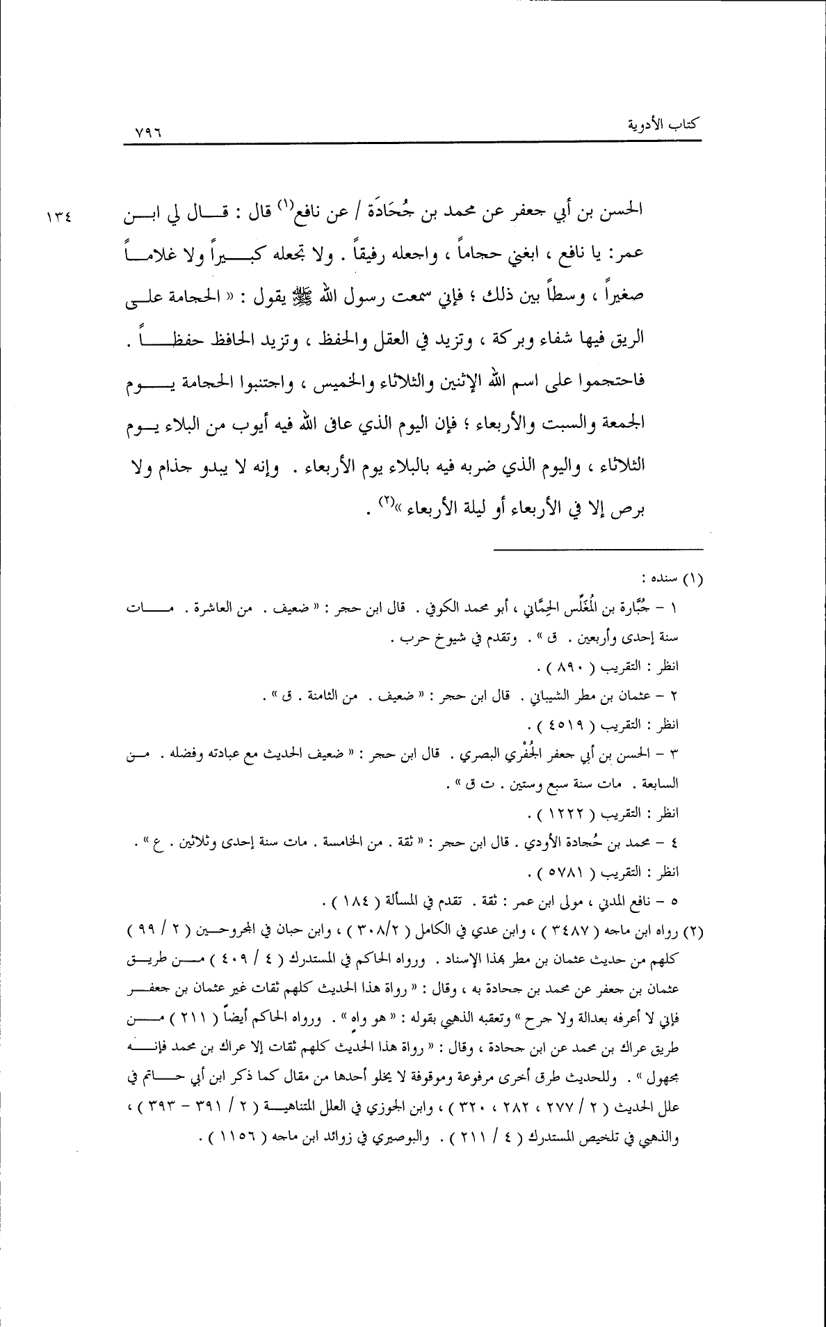 الحسن بن أبي جعفر، عن محمد بن جحادة/131/، عن نافع قال: قال لي ابن عمر: يا نافع ابتغى حجامًا واجعله رفيقًا، ولا تجعله كبيرًا، ولا غلامًا صغيرًا وسطًا بين ذلك فإني سمعت رسول الله - صلى الله عليه وسلم - يقول: ((الحجامة على الريق فيها شفاء وبركة، وتزيد في العقل والحفظ، وتزيد الحافظ حفظًا، فاحتجموا على اسم الله الاثنين والثلاثاء والخميس، واجتنبوا الحجامة يوم الجمعة والسبت والأربعاء فإن اليوم الذي عافى الله فيه أيوب من البلاء يوم الثلاثاء واليوم الذي ضربه فيه البلاء يوم الأربعاء، وأنه لا يبدو جذام ولا برص إلا في الأربعاء أو ليلة الأربعاء)).