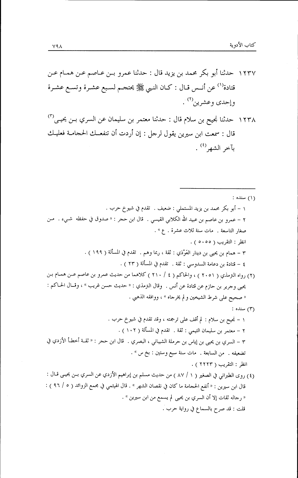 حدثنا أبو بكر محمد بن يزيد، قال: حدثنا عمرو بن عاصم، عن همام، عن قتادة، عن أنس قال: كان النبي - صلى الله عليه وسلم - يحتجم لسبع عشرة، وتسع عشرة، وإحدى وعشرين.