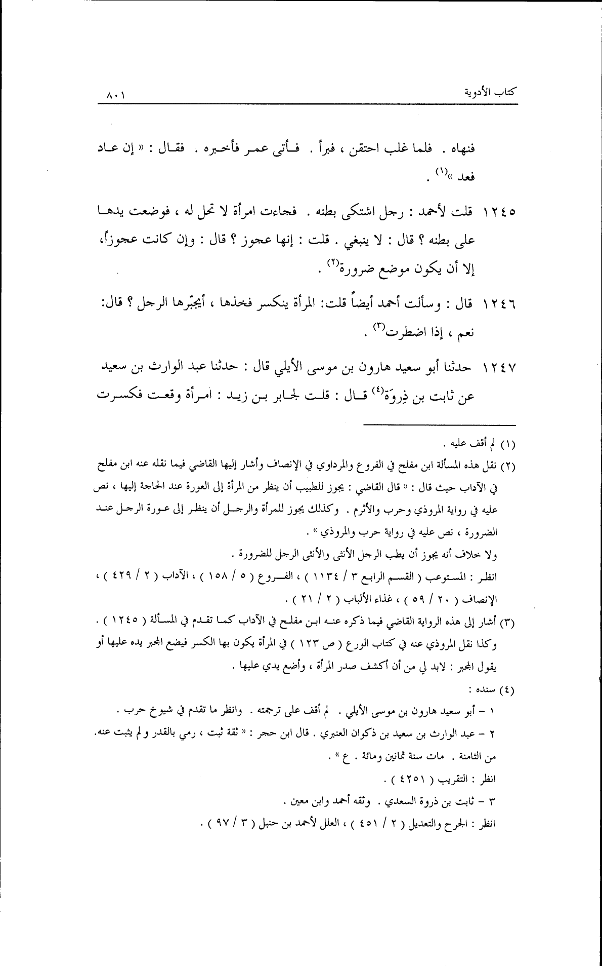 قال: وسألت أحمد أيضًا قلت: المرأة ينكسر فخذها أيجبرها الرجل؟ قال: نعم إذا اضطرت· قلت: فيضع يده على جسدها· قال: نعم إذا اضطرت.