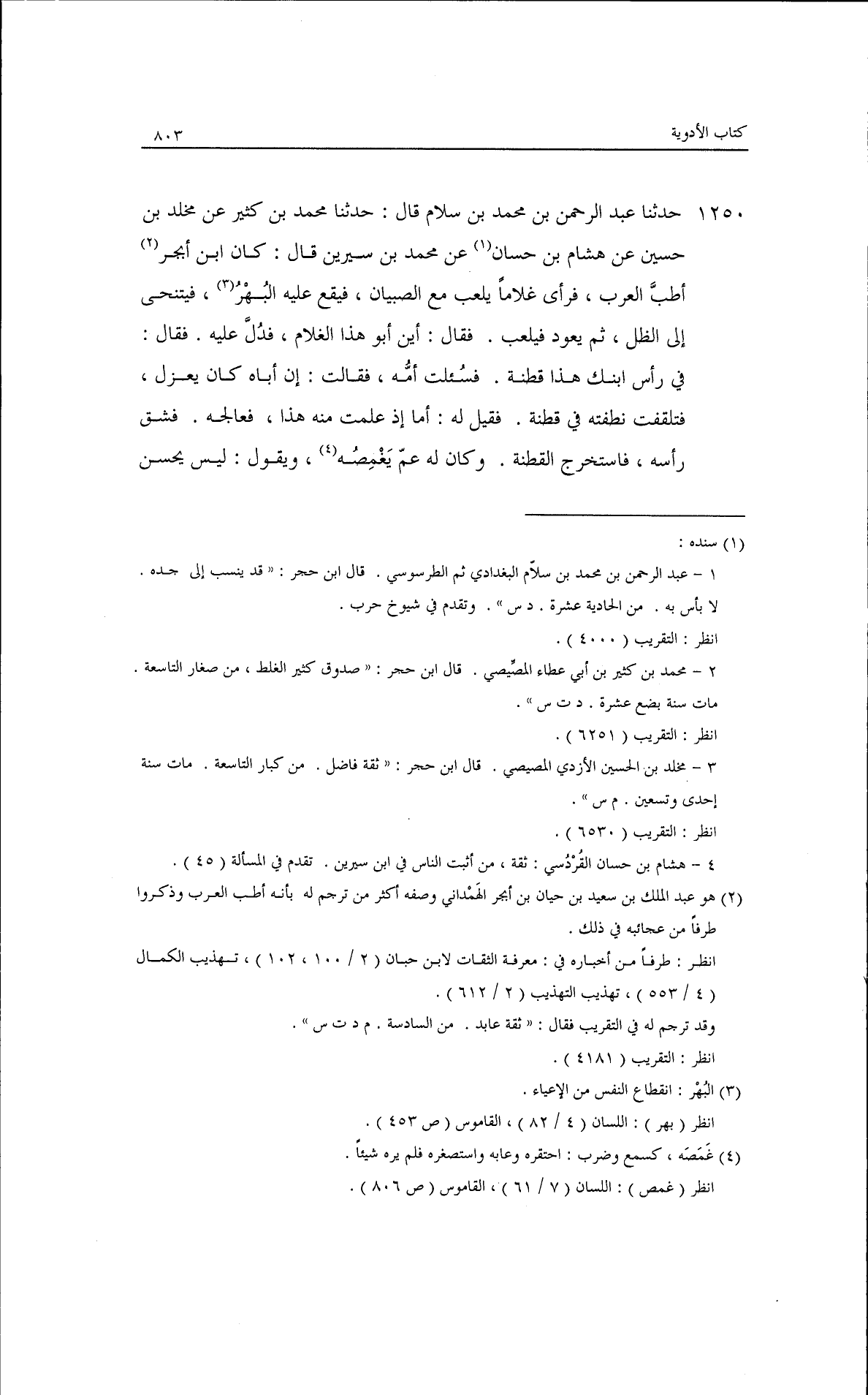 حدثنا عبد الرحمن بن محمد بن سلام قال: حدثنا محمد بن كثير، عن مخلد بن حسين، عن هشام بن حسان، عن محمد بن سيرين قال: كان (ابن أبحر أطب) (¬1) العرب فرأى غلامًا يلعب مع الصبيان فيقع عليه البهر فيتنحى إلى الظل، ثم يعود فيلعب· فقال: أين أبو هذا الغلام؟ فدل عليه· فقال: في رأس ابنك هذا قطنة. فسُئِلت أمه، فقالت: إن أباه كان يعزل فتلقفت نطفته في قطنة فقِيل له: أما إذا علمت منه هذا فعالجه. فشق رأسه فاستخرج القطنة فذهب البهر. وكان له عم يغمضه ويقول: ليس يحسن