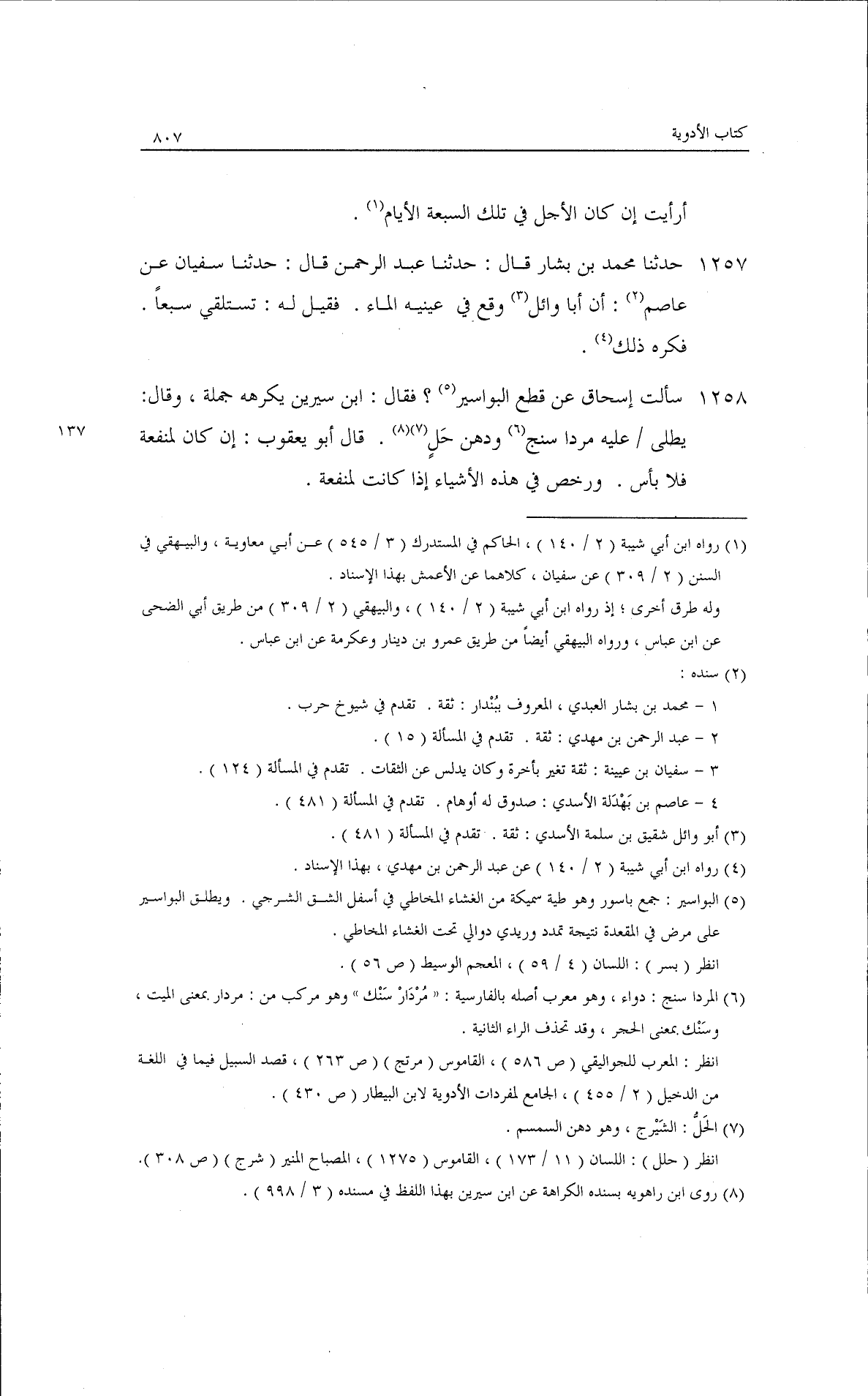سألت إسحاق· عن قطع البواسير؟ فقال: ابن سيرين يكرهه جملةً، وقال: يطلي/134/عليه مردا سنج ودهن خل. قال أبو يعقوب: إن كان لمنفعة فلا بأس، ورخص في هذه الأشياء إذا كانت لمنفعة.
