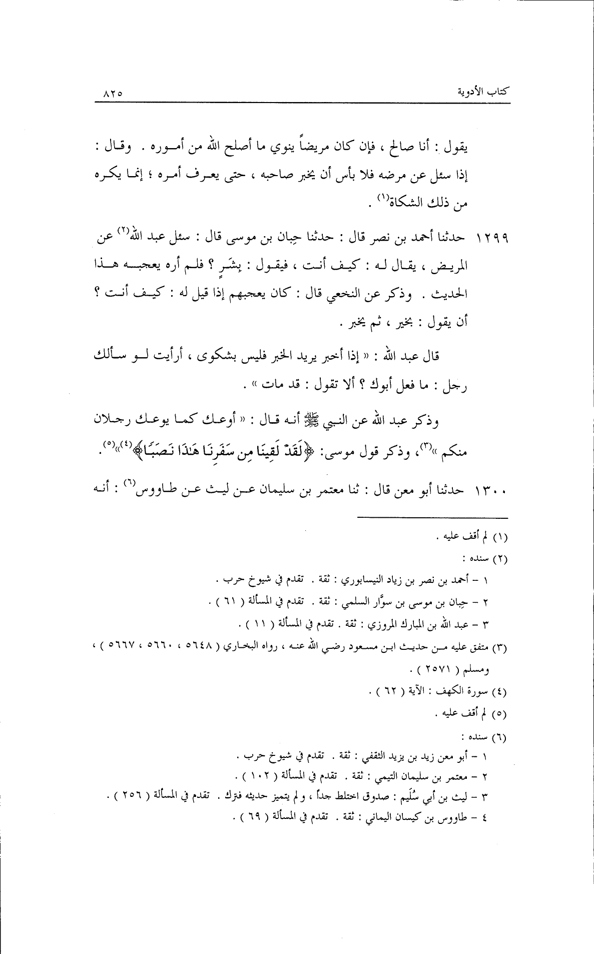 حدثنا أحمد بن نصر، قال: حدثنا حبان بن موسى قال: سُئلَ عبد الله عن المريض يقال له كيف أنت فيقول: بشر؟ فلم أره يعجبه هذا الحديث، وذكر عن النخعي قال: كان يعجبهم إذا قِيل له: كيف أنت أن يقول: بخير ثم يخبر· قال عبد الله: إذا أخبر يريد الخبر فليس بشكوى أرأيت لو سألك رجل ما فعل أبوك؟ ألا تقول قد مات؟ وذكر عبد الله عن النبي - صلى الله عليه وسلم - أنه قال: ((أوعك كما يوعك رجلان منكم)) وذكر قول موسى: {لَقَدْ لَقِينَا مِن سَفَرِنَا هَذَا نَصَبًا} [الكهف: 62].