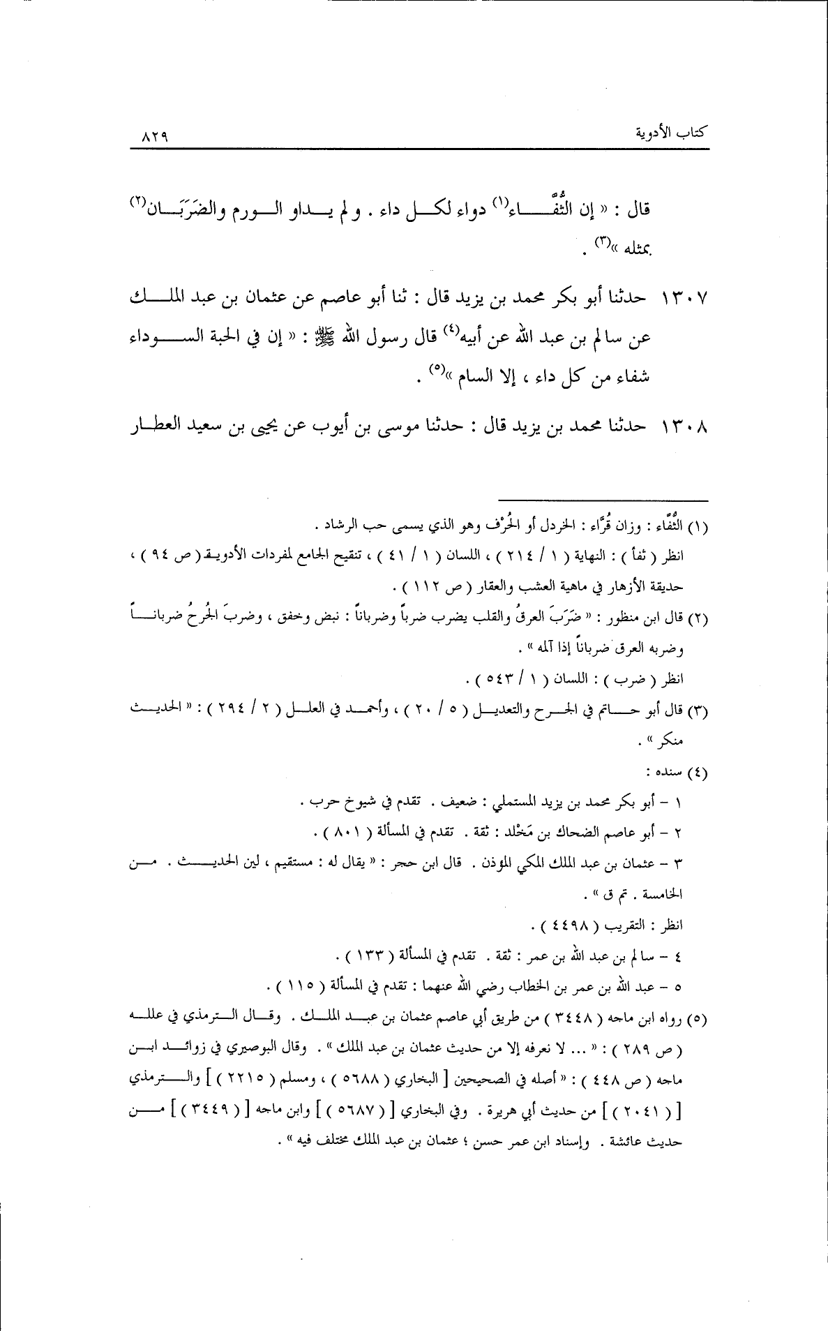 حدثنا أبو بكر محمد بن يزيد، قال: ثنا أبو عاصم، عن عثمان بن عبد الملك، عن سالم بن عبد الله، عن أبيه: قال رسول الله - صلى الله عليه وسلم -: ((إن في الحبة السوداء شفاء من كل داء إلا السام)).
