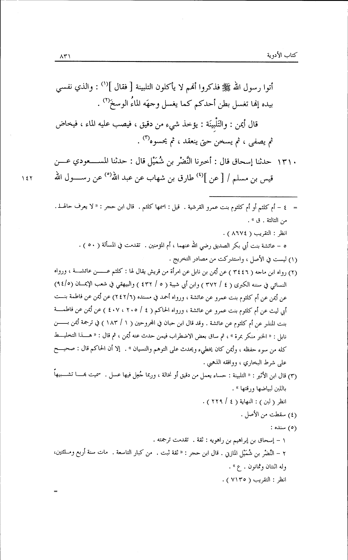 أتوا رسول الله - صلى الله عليه وسلم - فذكروا أنهم لا يأكلون التلبينة والذي نفسي بيده إنها تغسل بطن أحدكم كما يغسل وجهه الماء الوسخ· قال أيمن: والتلبينة يؤخذ شيء من دقيق فيصُب عليه الماء فيخاض ثم يصفى ثم يسخن حتى ينعقد ثم تحسوه.