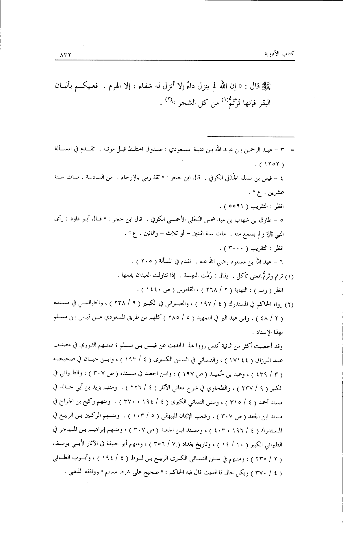 صلى الله عليه وسلم - قال: ((إن الله لم ينزل داء إلا أنزل له شفاء إلا الهرم فعليكم بألبان البقر فإنها ترم من كل الشجر)).