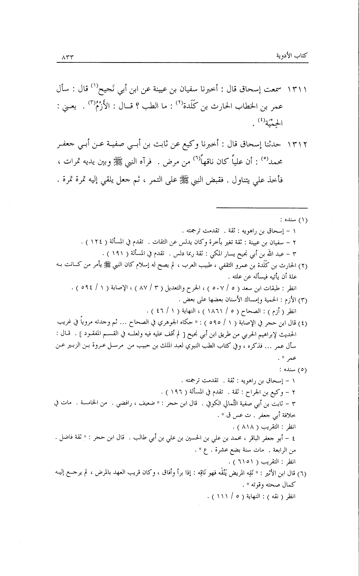 سمعت إسحاق، قال: أخبرنا سفيان بن عيينة، عن ابن أبي نجيح قال: سأل عمر بن الخطاب الحارث بن كلدة: ما الطب؟ قال: الأزم يعني الحمية.