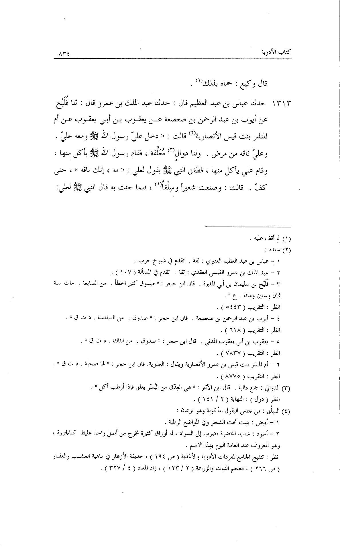حدثنا عباس بن عبد العظيم قال: حدثنا عبد الملك بن عمرو قال: ثنا فليح، عن أيوب بن عبد الرحمن بن صعصعة، عن يعقوب بن أبي يعقوب، عن أم المنذر بنت قيس الأنصارية قالت: دخل عليَّ رسول الله - صلى الله عليه وسلم - ومعه علي، وعلي ناقه من مرض، ولنا دوال معلقة، فقام رسول الله - صلى الله عليه وسلم - يأكل منها وقام علي يأكل منها، فطفق النبي - صلى الله عليه وسلم - يقول لعلي: ((مه إنك ناقِةٌ)) حتى كفَّ· قالت: وصنعت شعيرًا وسلقًا فلما جئت به قال النبي - صلى الله عليه وسلم - لعلي