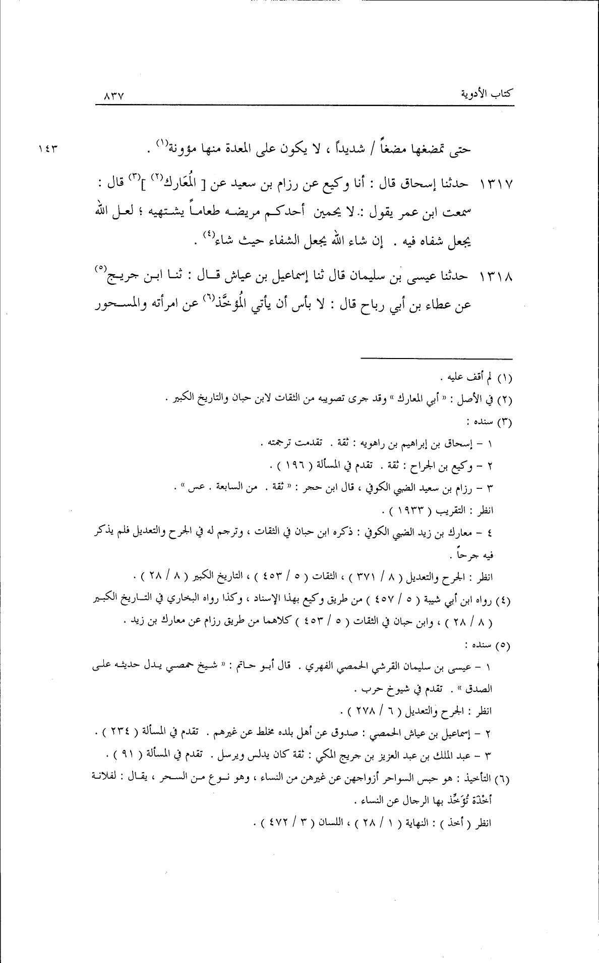 حدثنا إسحاق، قال: أنا وكيع، عن رزام بن سعيد ثقة، عن أبي المعارك قال: سمعت ابن عمر يقول: لا يحمين أحدكم مريضه طعامًا يشتهيه، لعل الله يجعل شفاه فيه إن شاء الله يجعل الشفاء حيث شاء.