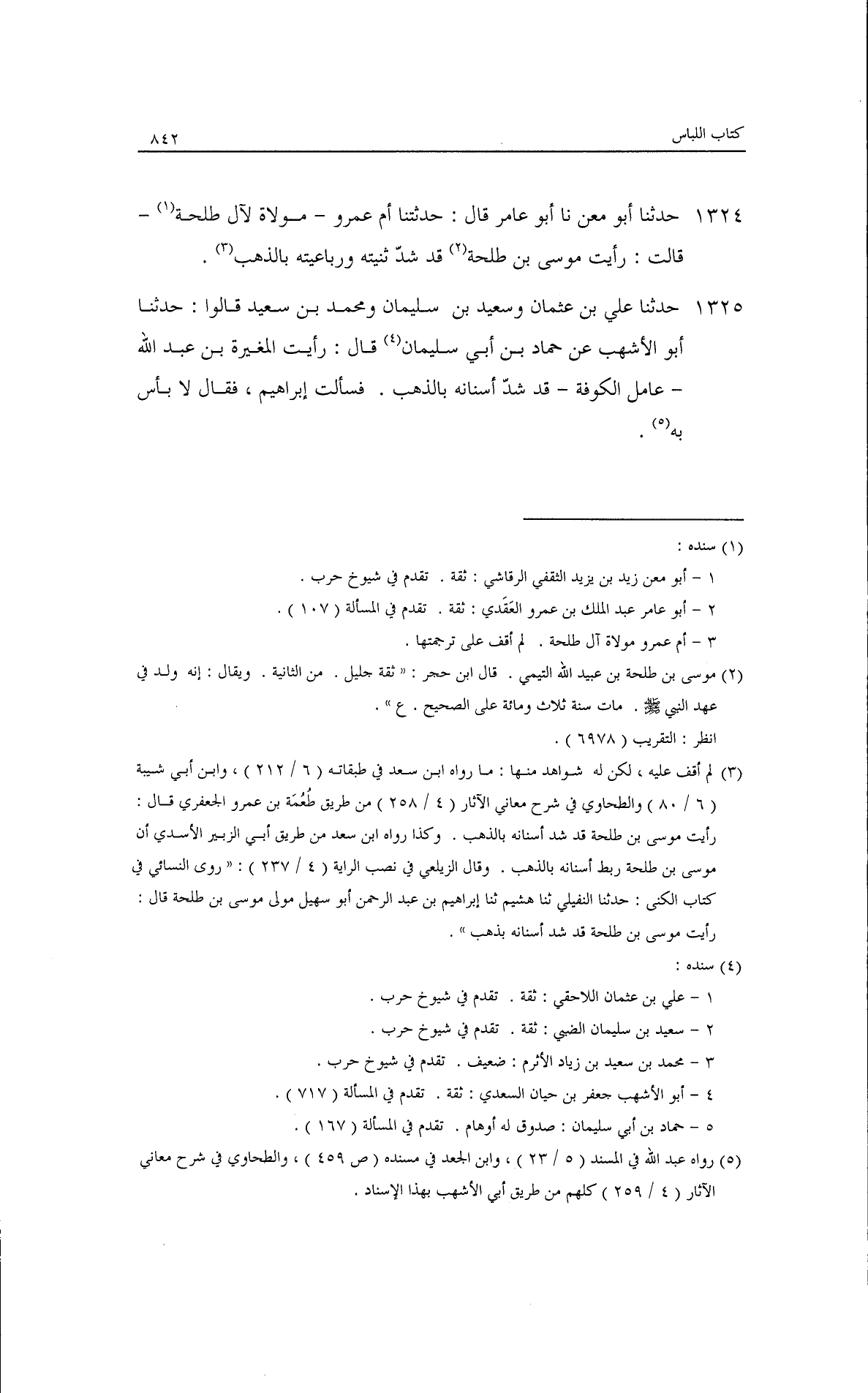 حدثنا أبو معن، قال: ثنا أبو عامر، حدثتنا أم عمر مولاة لآل طلحة قالت: رأيت موسى بن طلحة قد شد ثنتيه ورباعيته بالذهب.