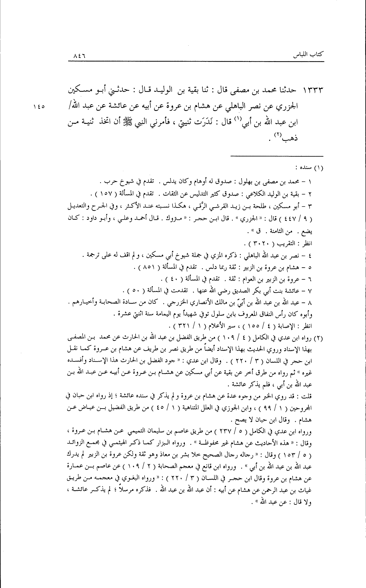 حدثنا محمد بن مصفى، قال: ثنا بقية بن الوليد، قال: حدثني أبو مسكين الجزري، عن نصر الباهلي، عن هشام بن عروة، عن أبيه، عن عائشة، عن عبد الله بن عبد الله بن أبي قال: نذرت ثنيتي، فأمرني النبي - صلى الله عليه وسلم - إن أتخذ ثنية من ذهب.