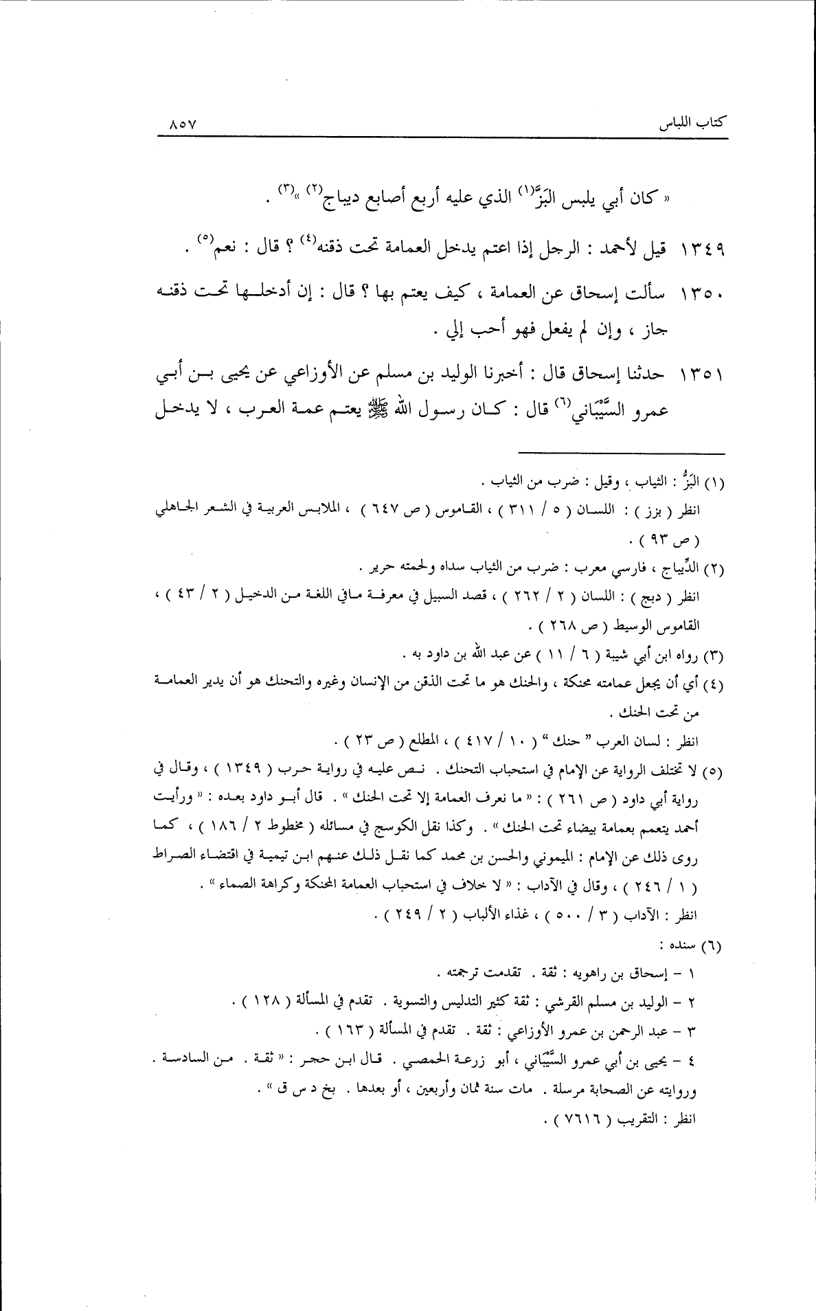 سألت إسحاق عن العمامة كيف يعتم بها قال: إن أدخلها تحت ذقنه جاز، وإن لم يفعل فهو أحب إليّ.