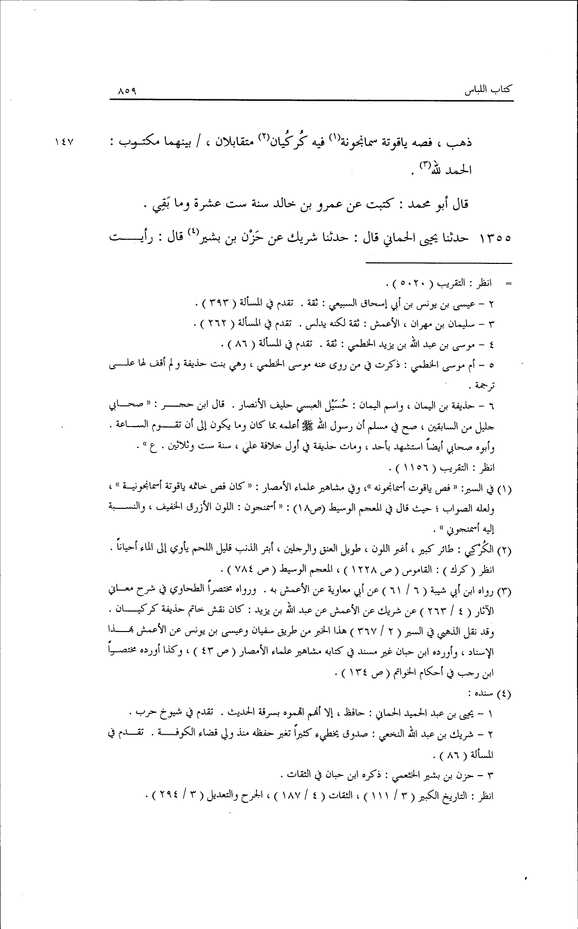 ذهب فصه ياقوتة سمانجونة فيه كركيان متقابلان/142/بينهما مكتوب: الحمد لله·قال أبو محمد: كتبت عن عمرو بن خالد سنة ست عشرة ومائتين.
