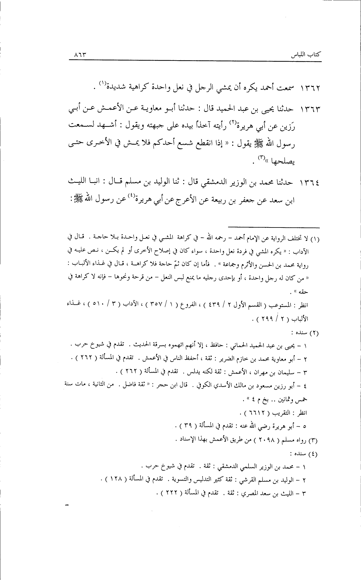 حدثنا يحيى بن عبد الحميد، قال: حدثنا أبو معاوية، عن الأعمش، عن أبي رزين، عن أبي هريرة· رأيته آخذًا بيده على جبهته ويقول: أشهد لسمعت رسول الله - صلى الله عليه وسلم - يقول: ((إذا انقطع شسع أحدكم فلا يمش في الأخرى حتى يصلحها)).