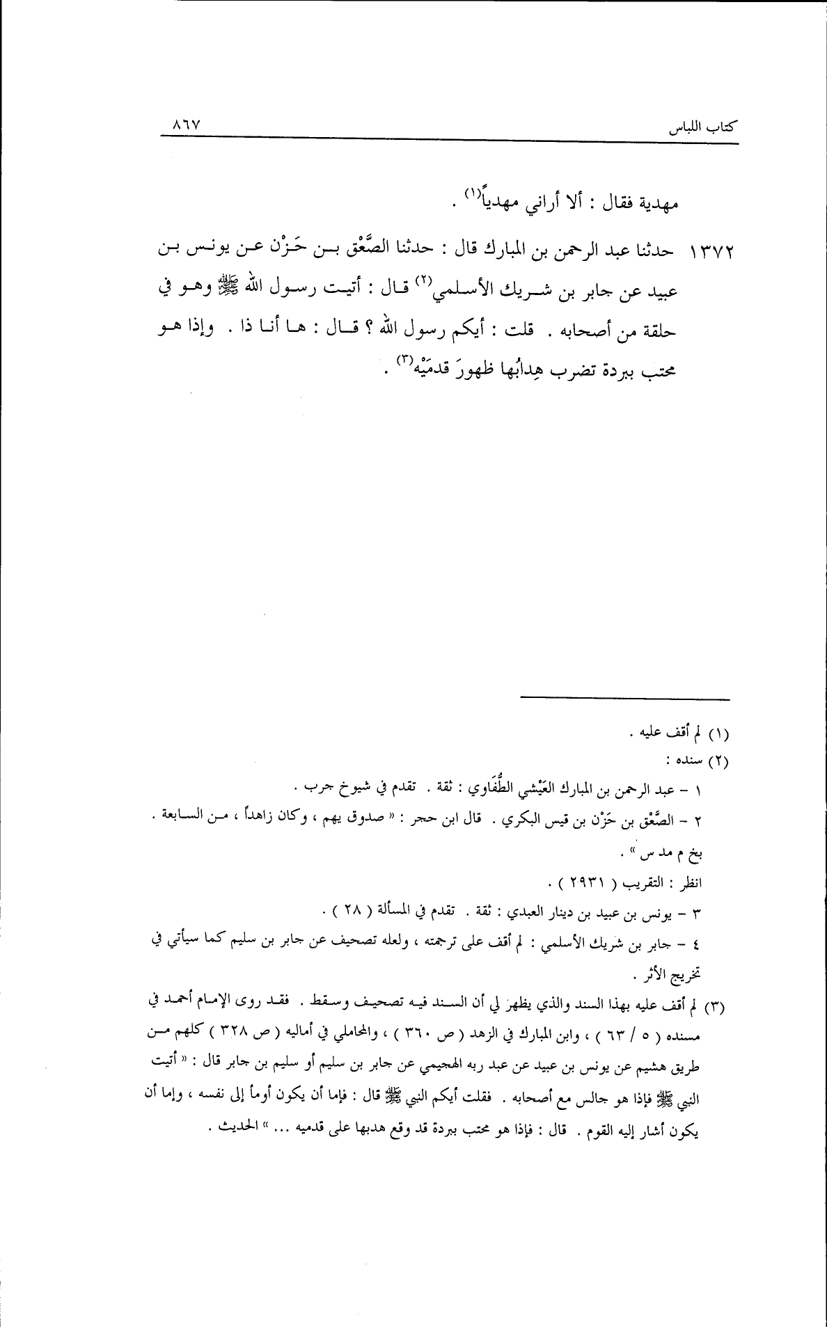 حدثنا عبد الرحمن بن المبارك قال: حدثنا الصعق بن حزن، عن يونس بن عبيد، عن جابر بن شريك الأسلمي قال: أتيت رسول الله - صلى الله عليه وسلم - وهو في حلقة من أصحابه قلت: أيكم رسول الله؟ قال: ((ها أنا ذا)) · وإذا هو محتبي ببردة يضرب هدابها ظهور قدميه.